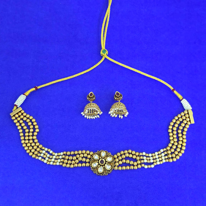227851 Antique Choker Necklace Set With Matte Gold Plating