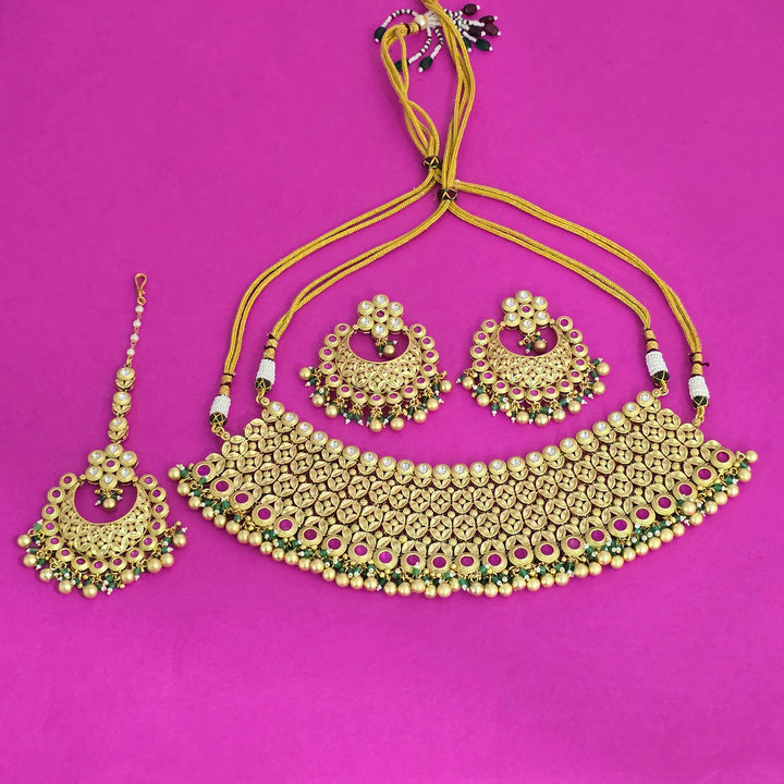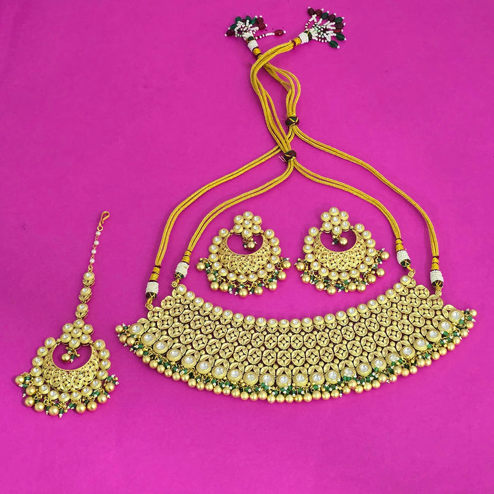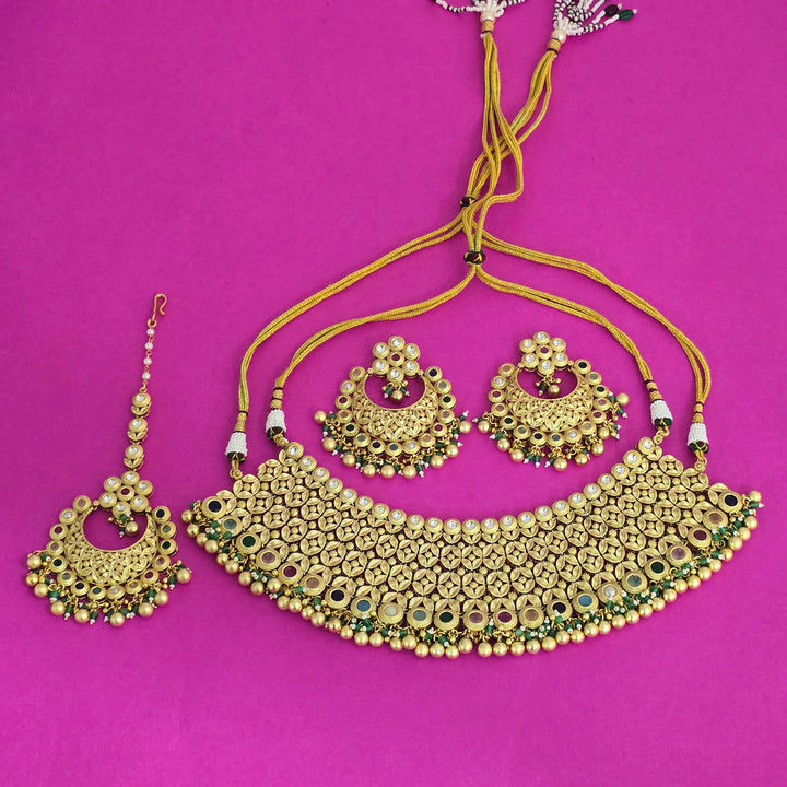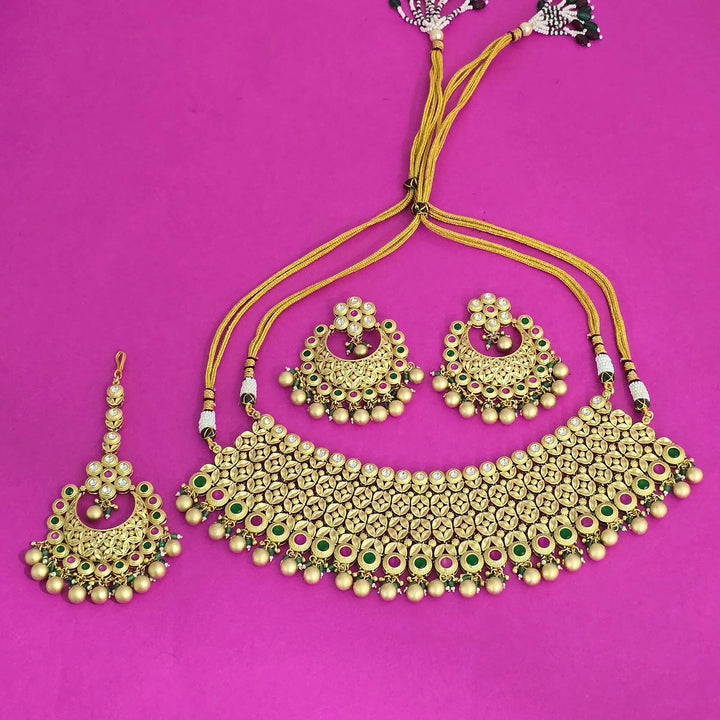 Weight: 244.0 Grams, Earring Height = 72 mm || Width = 65 mm,Regular Size And Adjustable,Bollywood Look,Matte Gold Plating,Antique Necklace Set