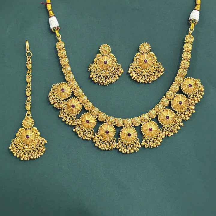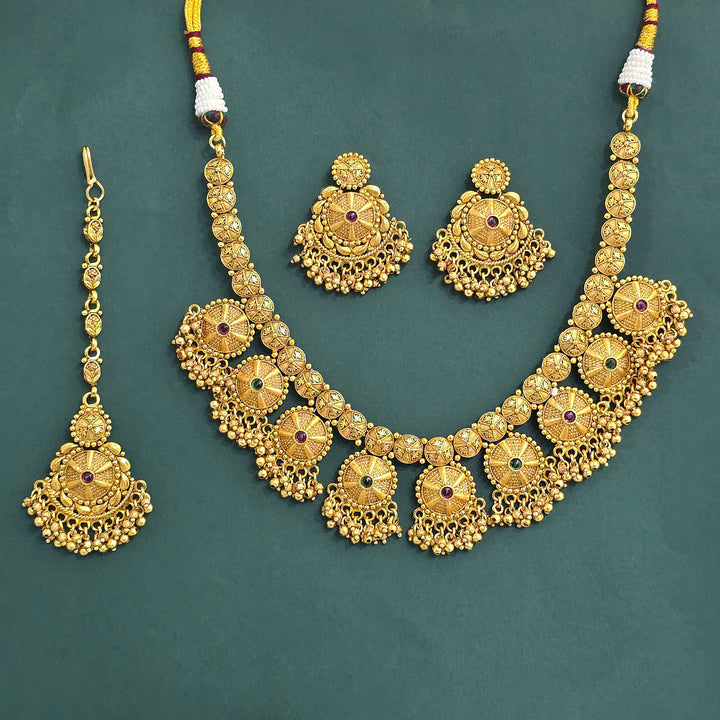 Weight: 104.0 Grams, Earring Height = 42 mm || Width = 37 mm,Regular Size And Adjustable,Bollywood Look,Gold Plating,Antique Necklace Set