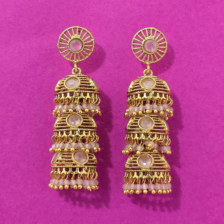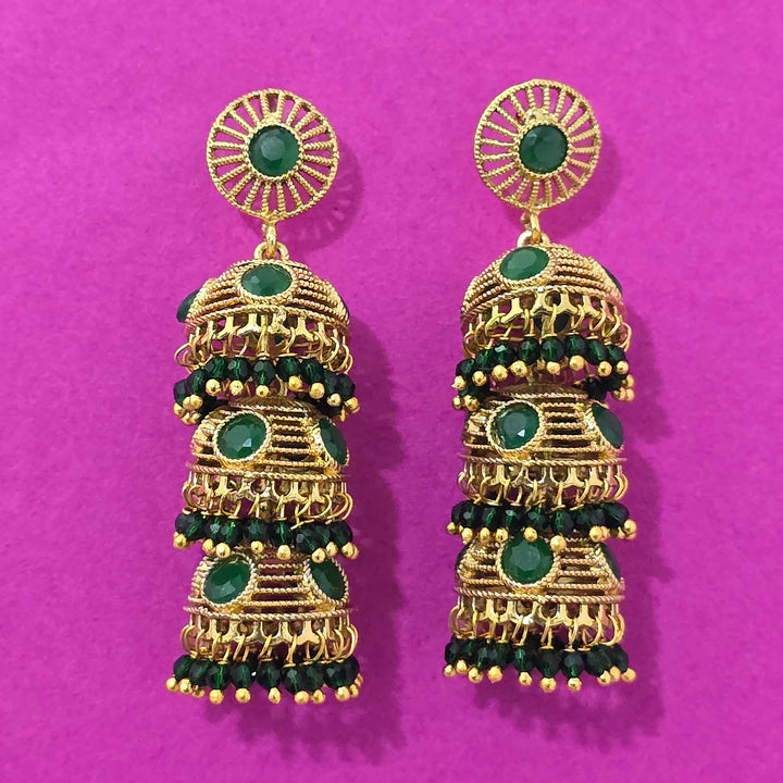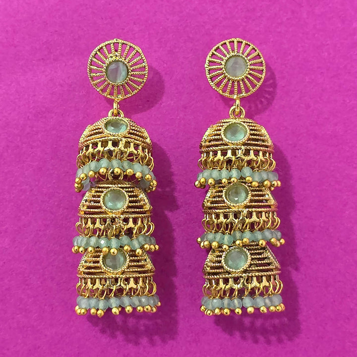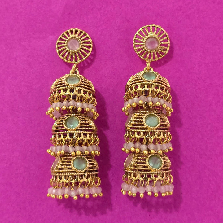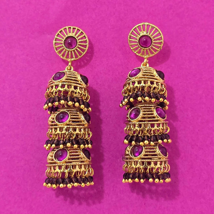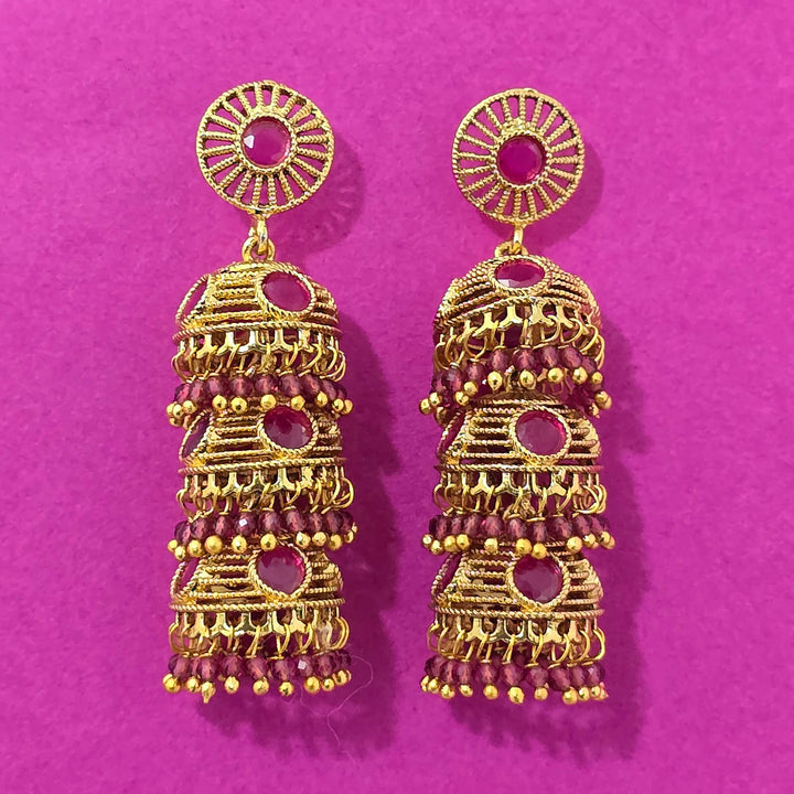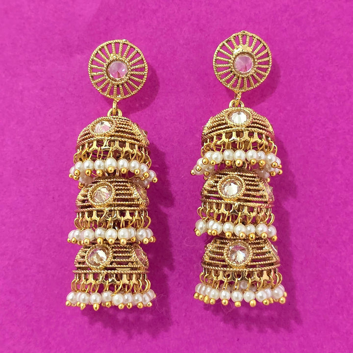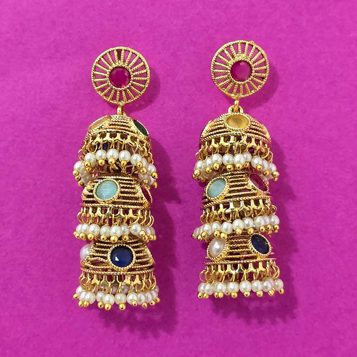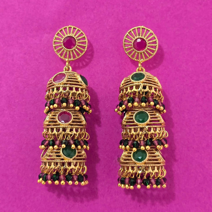 Weight: 20.0 Grams, Height = 54 mm || Width = 18 mm,Triple Jhumki,Gold Plating,Antique Earring