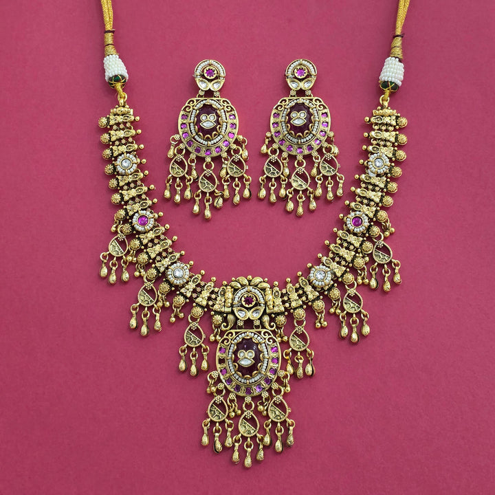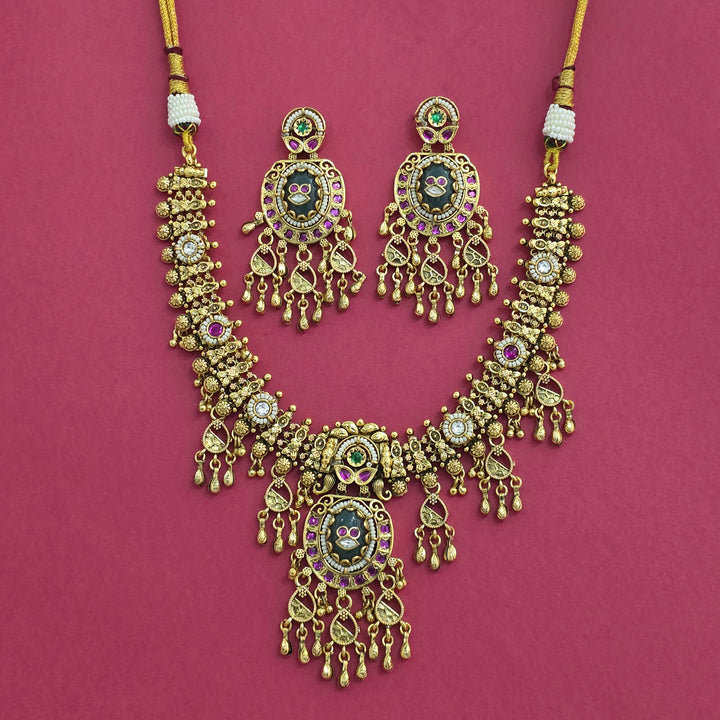 229115 Antique Moti Necklace Set With Matte Gold Plating