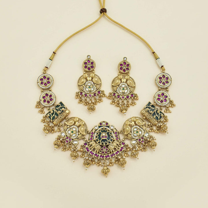 229409 Antique Moti Necklace Set With Matte Gold Plating