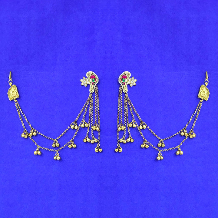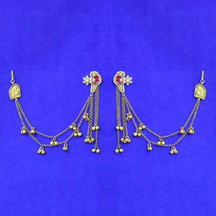 Weight: 42.0 Grams, Height = 110 mm || Width = 25 mm,Earring With Chain,Ghungru Earring,Matte Gold Plating,Antique Earring