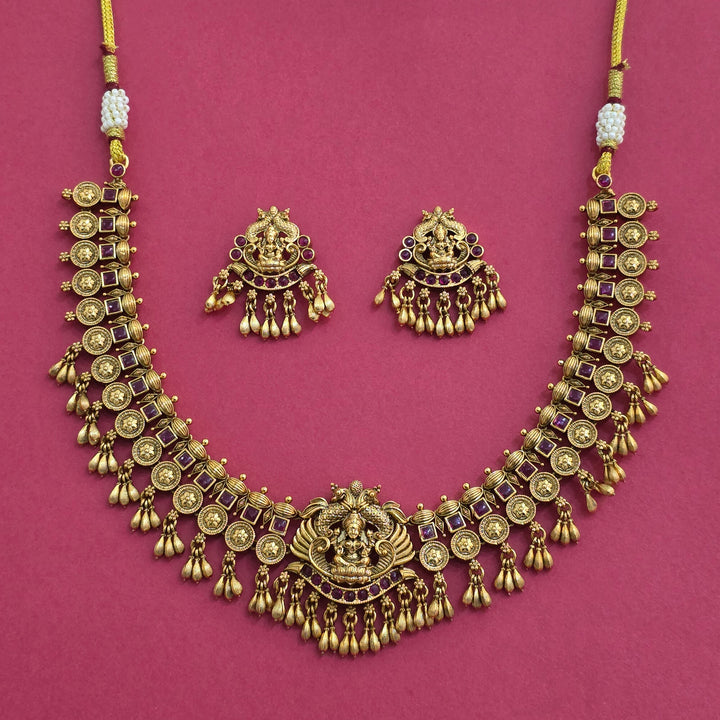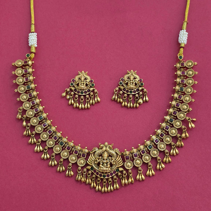 Weight: 84.0 Grams, Earring Height = 32 mm || Width = 32 mm,Regular Size And Adjustable,Temple Necklace,Matte Gold Plating,Antique Necklace Set