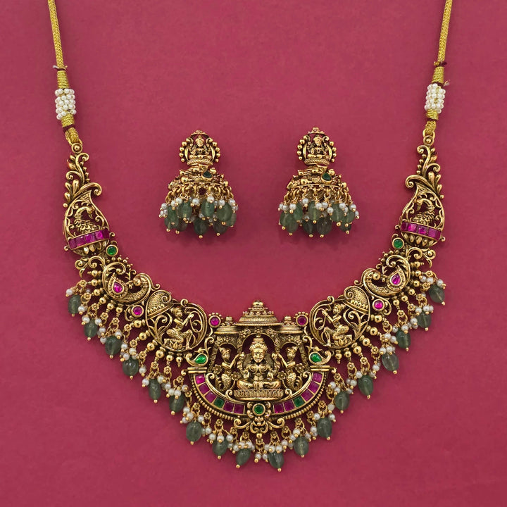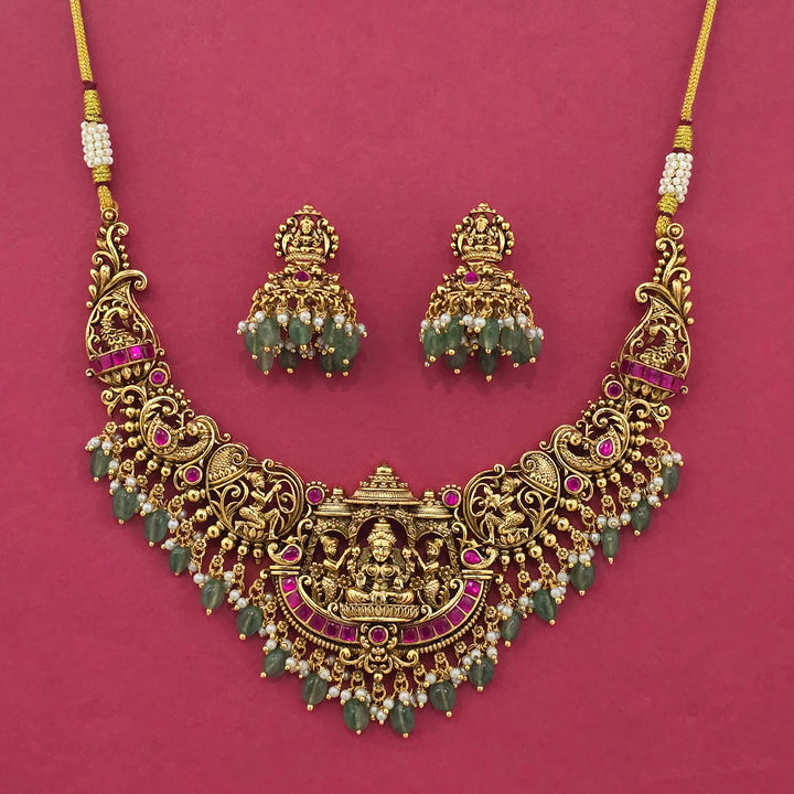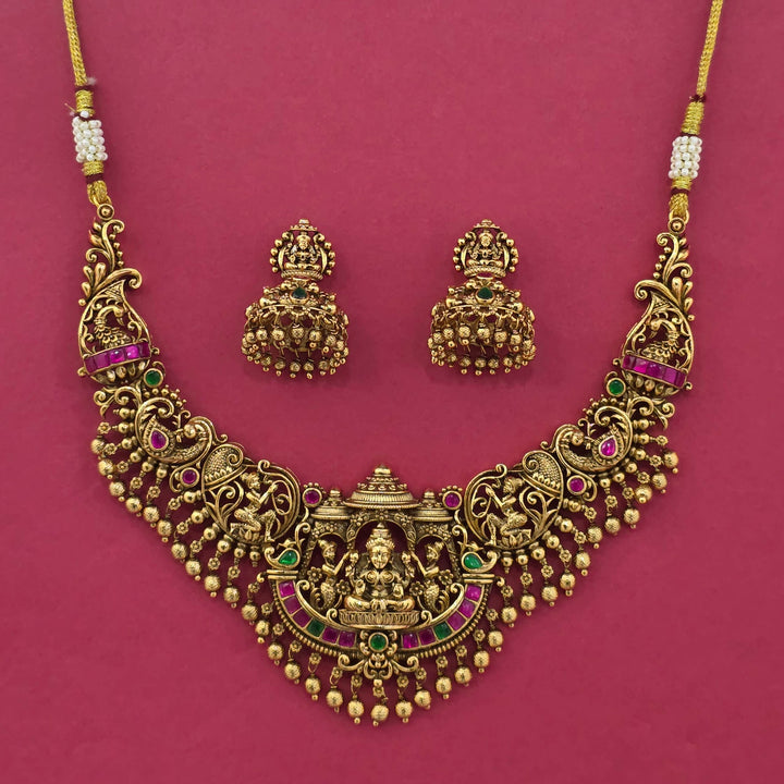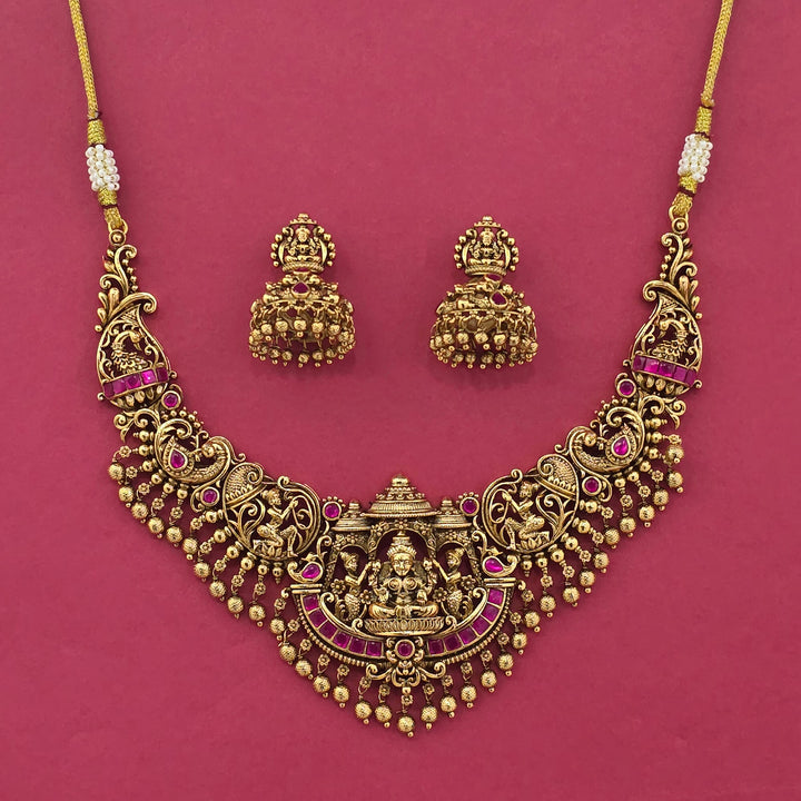 Weight: 115.0 Grams, Earring Height = 36 mm || Width = 25 mm,Regular Size And Adjustable,Temple Necklace,Matte Gold Plating,Antique Necklace Set