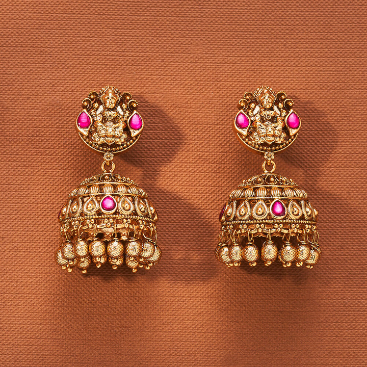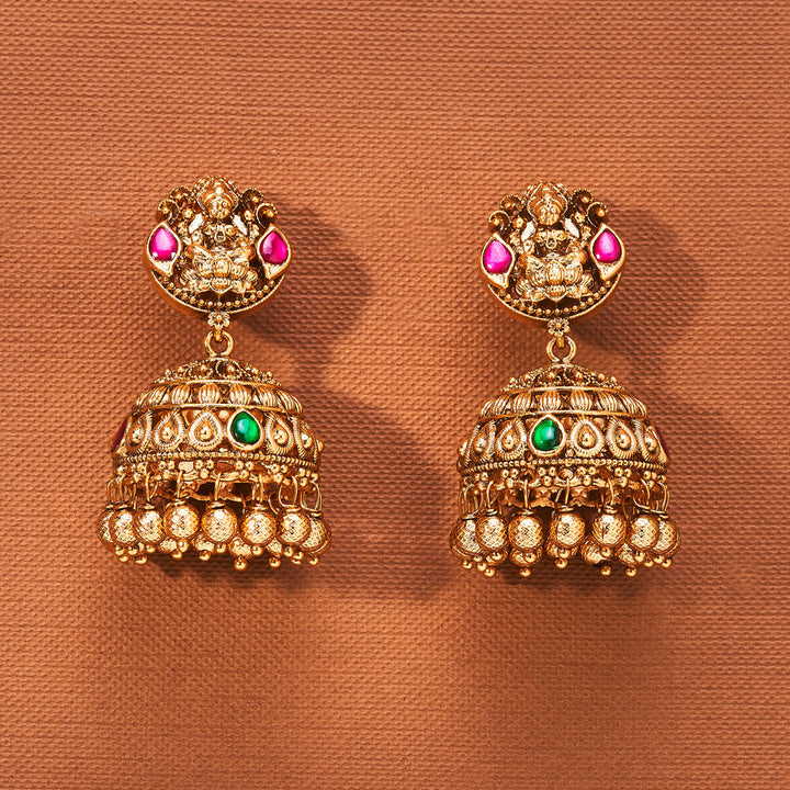 223607 Antique Temple Jhumki With Matte Gold Plating