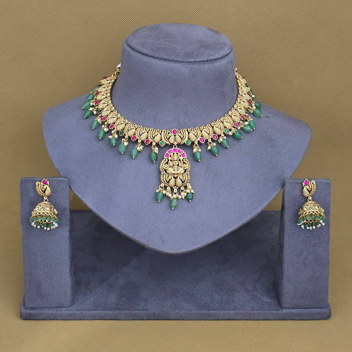 Weight: 85.0 Grams, Earring Height = 40 mm || Width = 23 mm,Regular Size And Adjustable,Peacock Necklace,Matte Gold Plating,Antique Necklace Set
