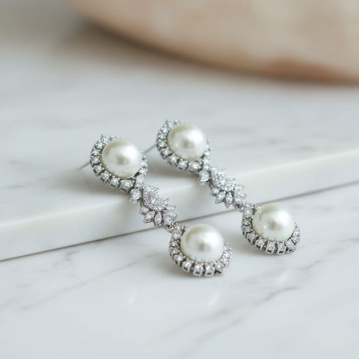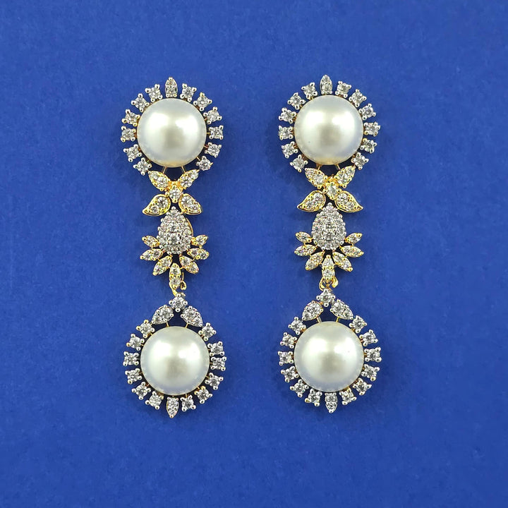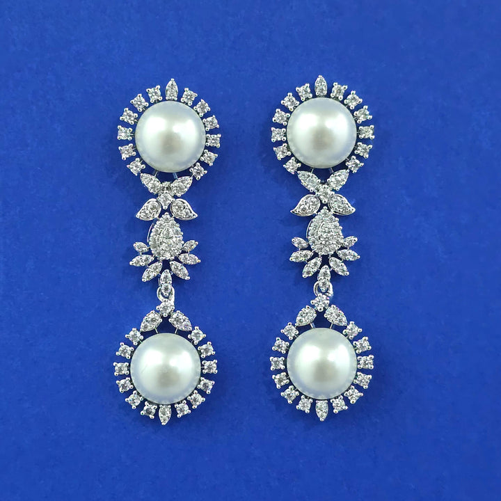 Weight: 11.0 Grams, Height = 48 mm || Width = 14 mm,Moti Earring,2 Tone Plating,Rhodium Plating,American Diamond Earring,American Diamond Earring