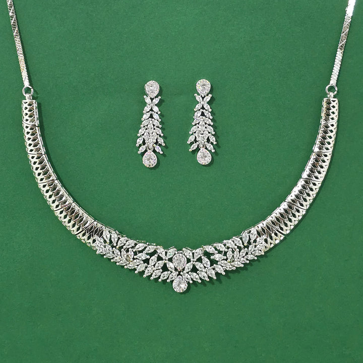 Weight: 34.0 Grams, Earring Height = 36 mm || Width = 12 mm,Regular Size And Adjustable,2 Tone Plating,Rhodium Plating,American Diamond Necklace Set