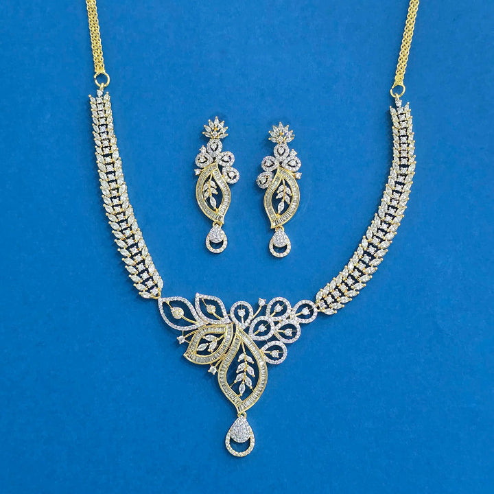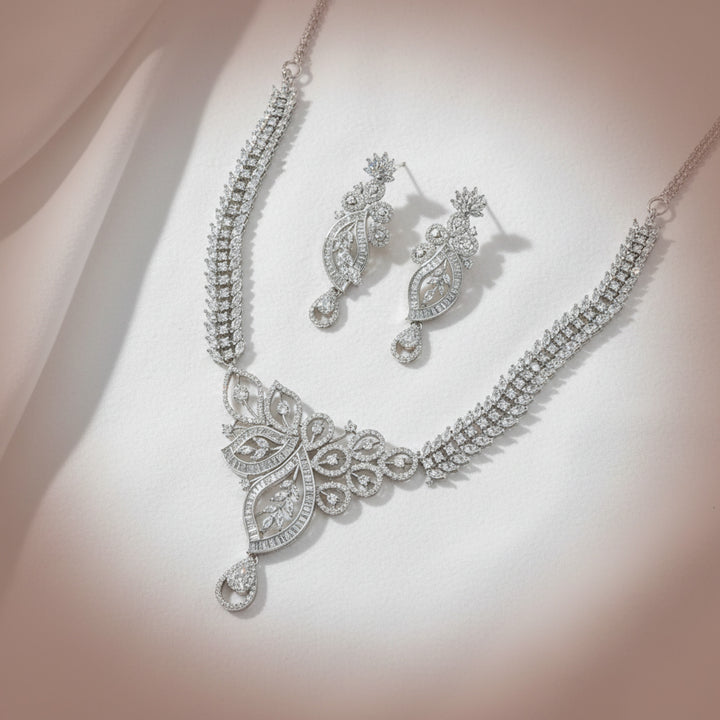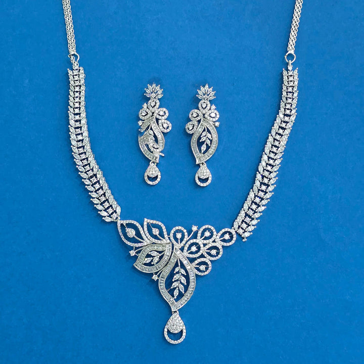 Weight: 42.0 Grams, Earring Height = 45 mm || Width = 15 mm,Regular Size And Adjustable,Latest Design,2 Tone Plating,Rhodium Plating,American Diamond Necklace Set