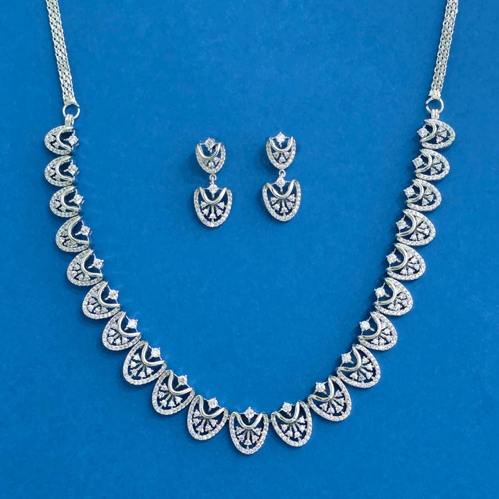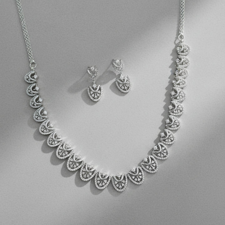 Weight: 32.0 Grams, Earring Height = 26 mm || Width = 10 mm,Regular Size And Adjustable,Delicate Design,2 Tone Plating,Rhodium Plating,American Diamond Necklace Set