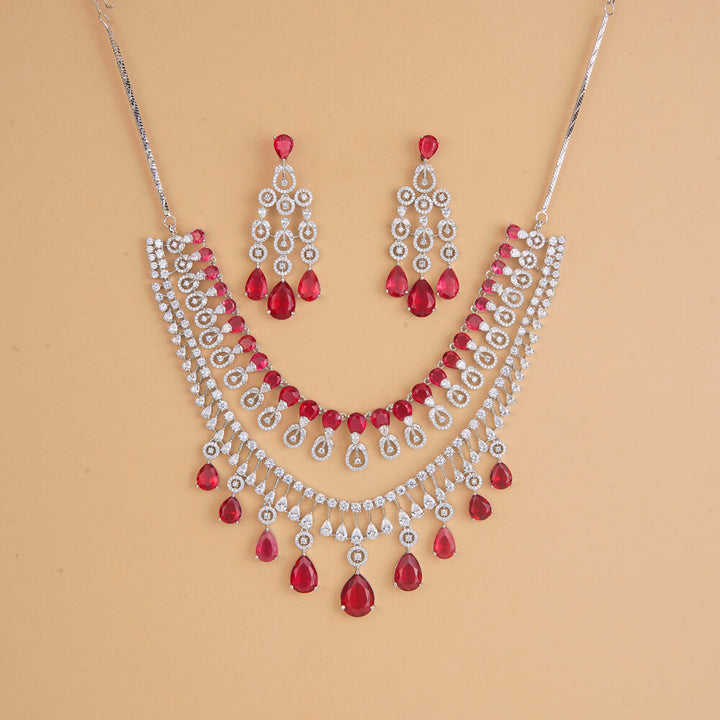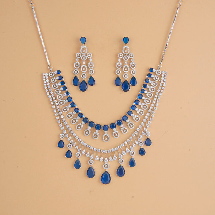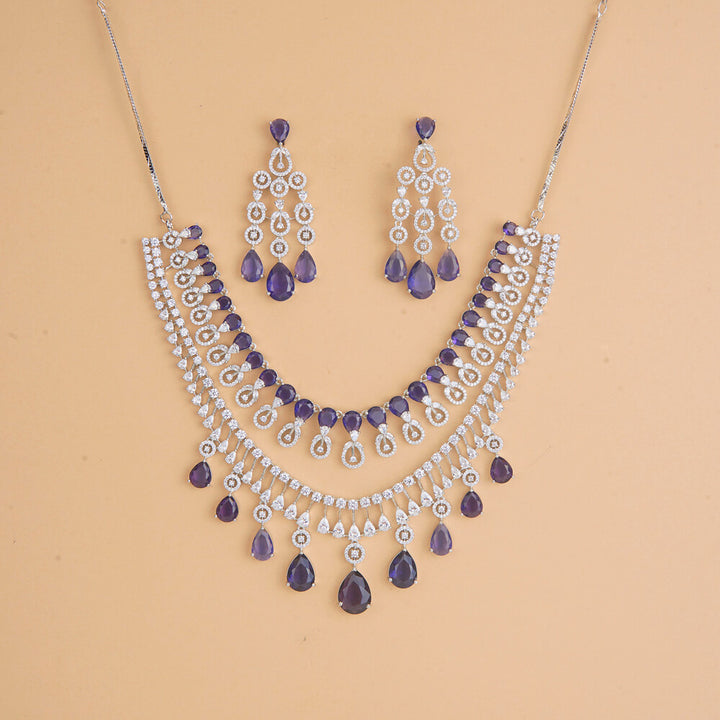Weight: 98.0 Grams, Earring Height = 65 mm || Width = 28 mm,Regular Size And Adjustable,Stone Necklace,Rhodium Plating,American Diamond Necklace Set