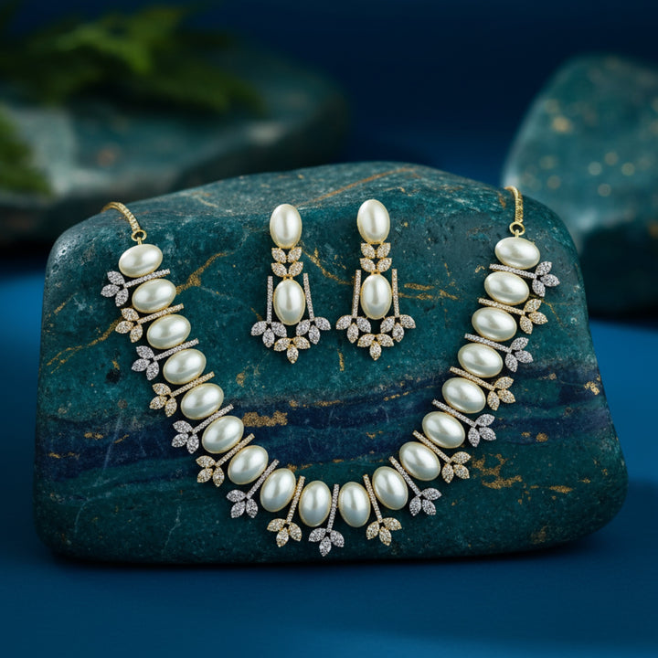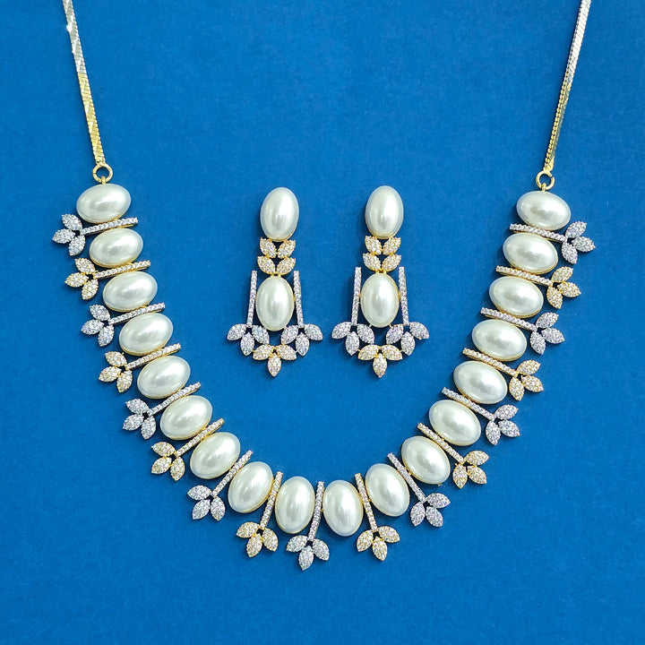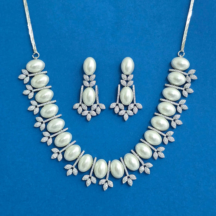 Weight: 65.0 Grams, Earring Height = 48 mm || Width = 25 mm,Regular Size And Adjustable,Moti Necklace,2 Tone Plating,Rhodium Plating,American Diamond Necklace Set