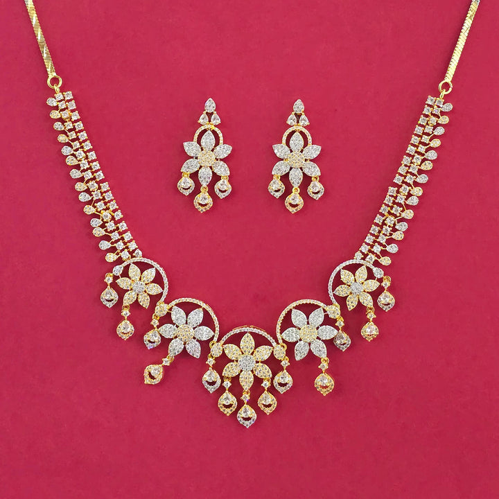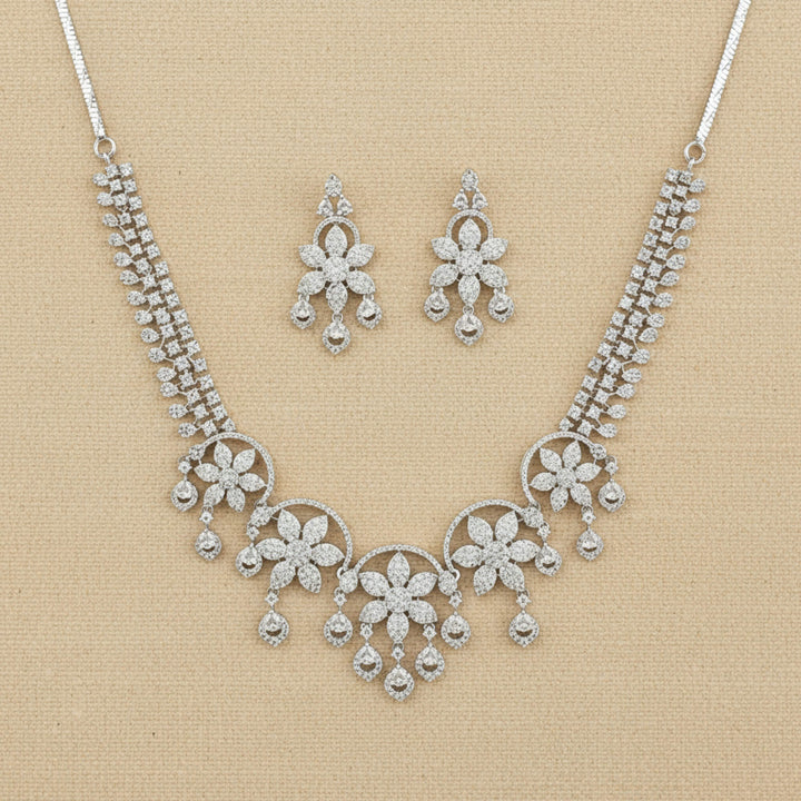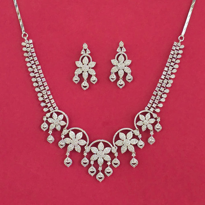 Weight: 51.0 Grams, Earring Height = 40 mm || Width = 20 mm,Regular Size And Adjustable,Trendy Look,2 Tone Plating,Rhodium Plating,American Diamond Necklace Set