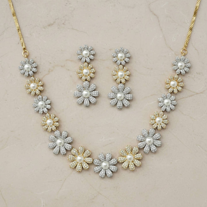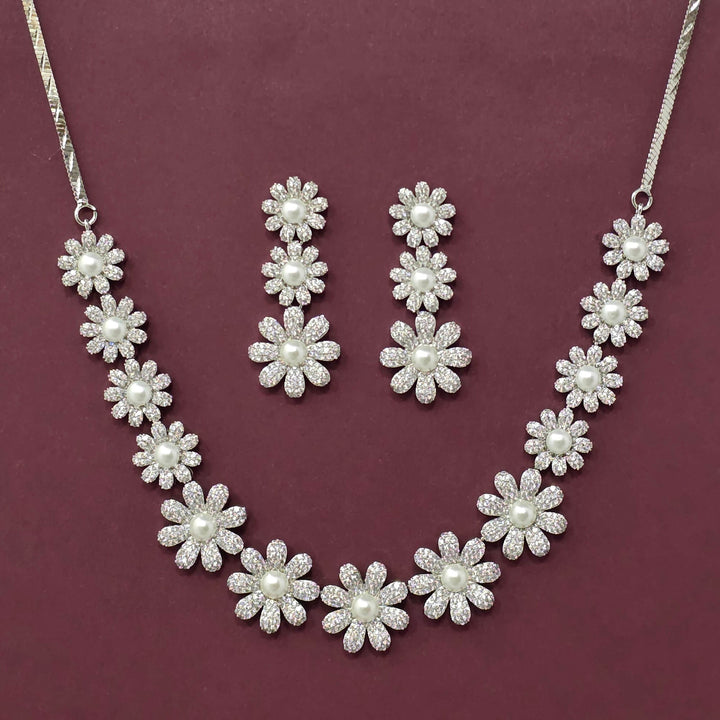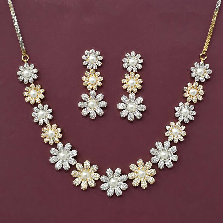 Weight: 50.0 Grams, Height = 49 mm || Width = 21 mm,Regular Size And Adjustable,2 Tone Plating,Rhodium Plating,American Diamond Necklace Set