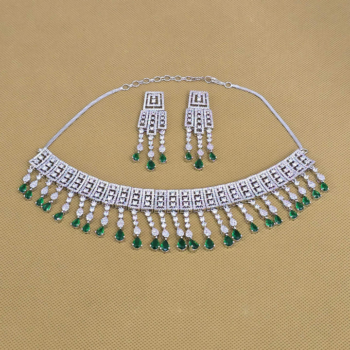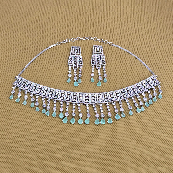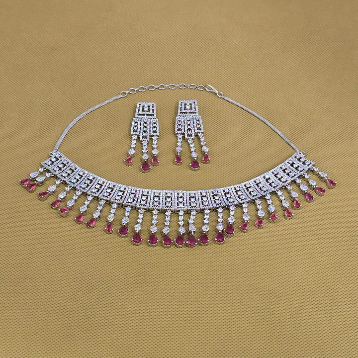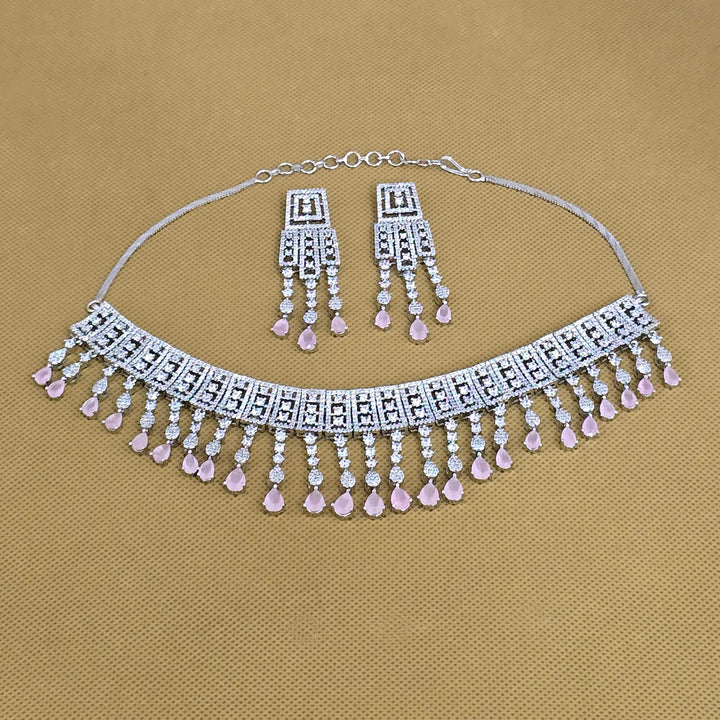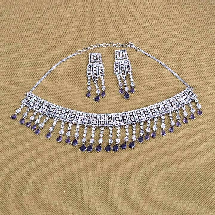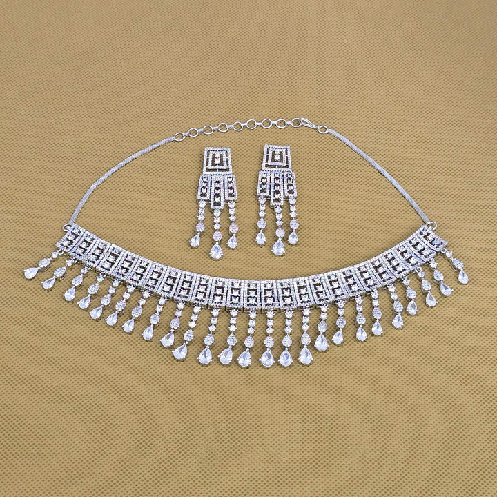 Weight: 72.0 Grams, Earring Height = 60 mm || Width = 18 mm,Regular Size And Adjustable,Choker Necklace,Rhodium Plating,American Diamond Necklace Set
