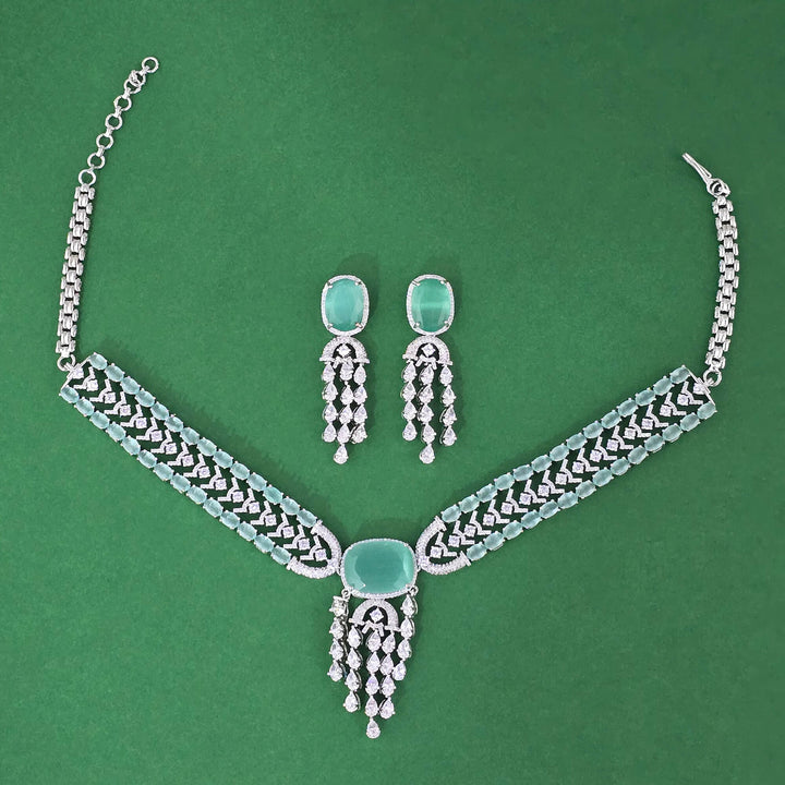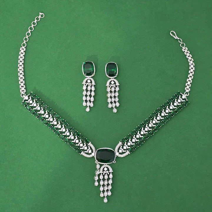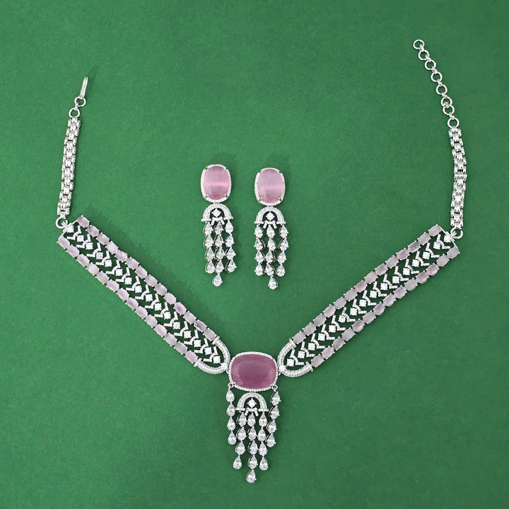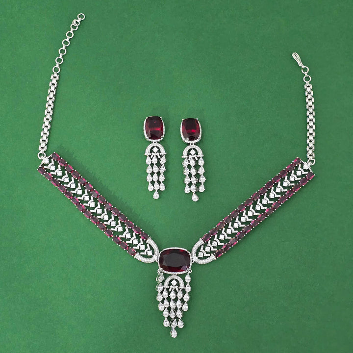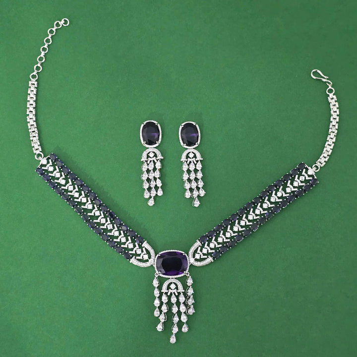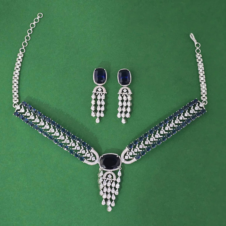 Weight: 74.0 Grams, Earring Height = 56 mm || Width = 15 mm,Regular Size And Adjustable,Choker Necklace,Rhodium Plating,American Diamond Necklace Set