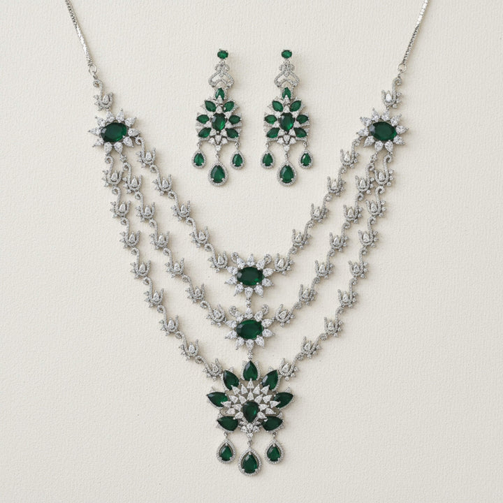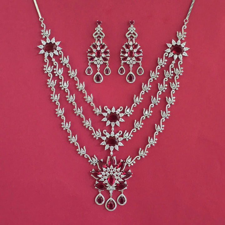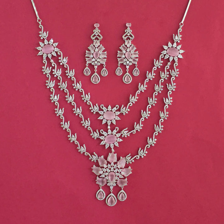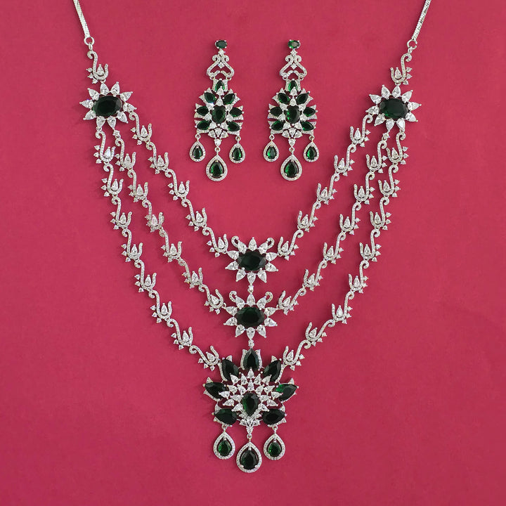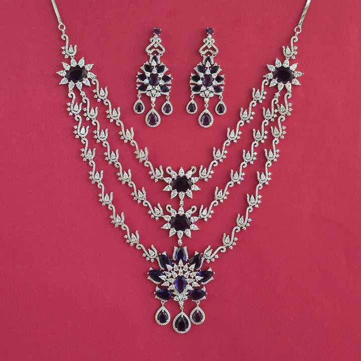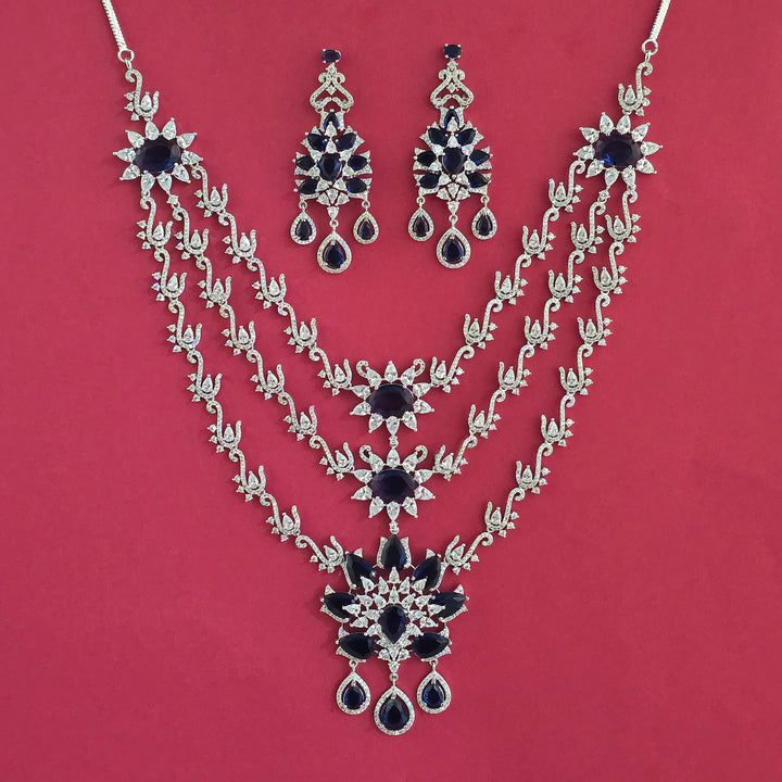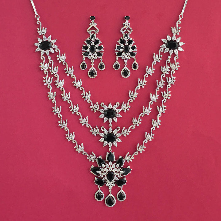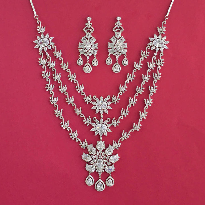 Weight: 118.0 Grams, Earring Height = 68 mm || Width = 28 mm,Regular Size (Approx 14 Inch) & Adjustable,Rhodium Plating,American Diamond Necklace Set