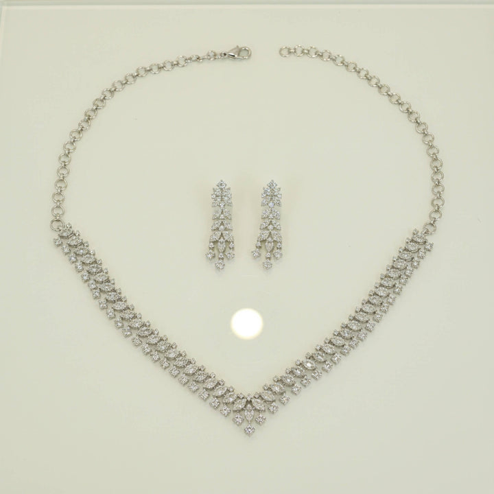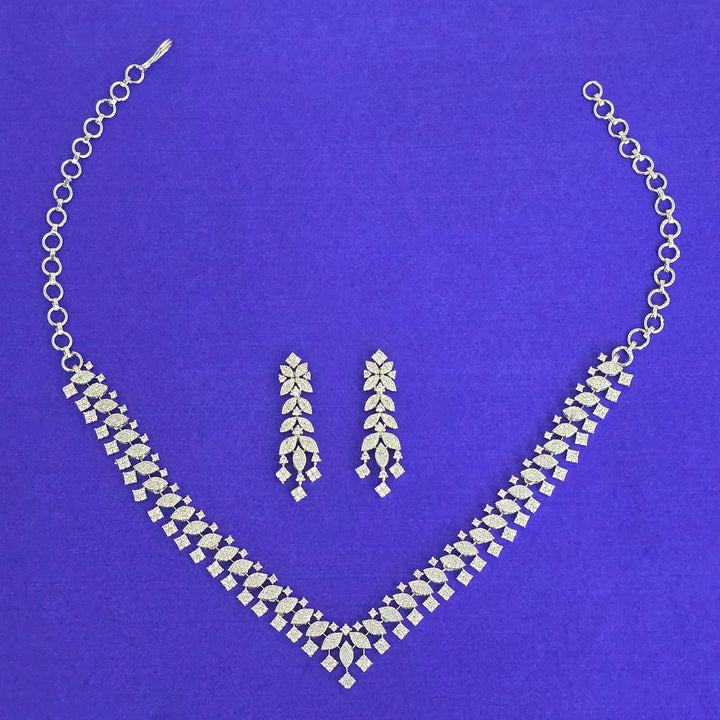 Weight: 34.0 Grams, Earring Height = 41 mm || Width = 14 mm,Regular Size And Adjustable,Rhodium Plating,American Diamond Necklace Set