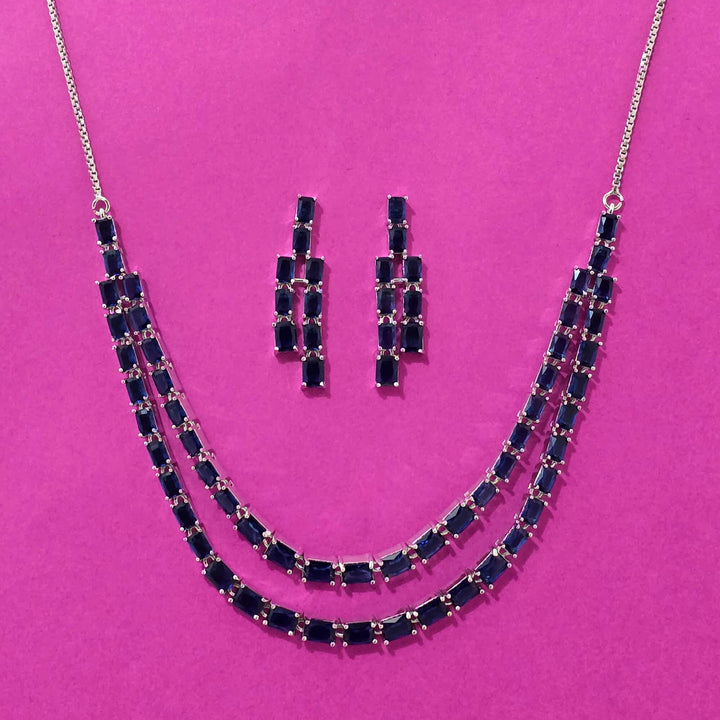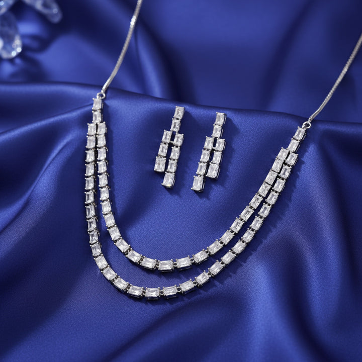Weight: 48.0 Grams, Earring Height = 45 mm || Width = 10 mm,Regular Size And Adjustable,2 Line Necklace,Rhodium Plating,American Diamond Necklace Set