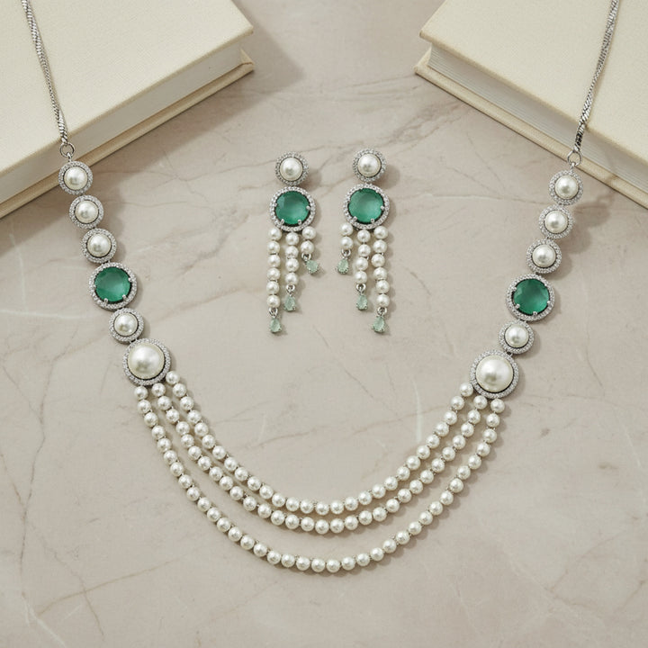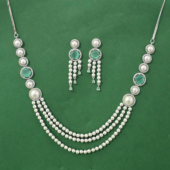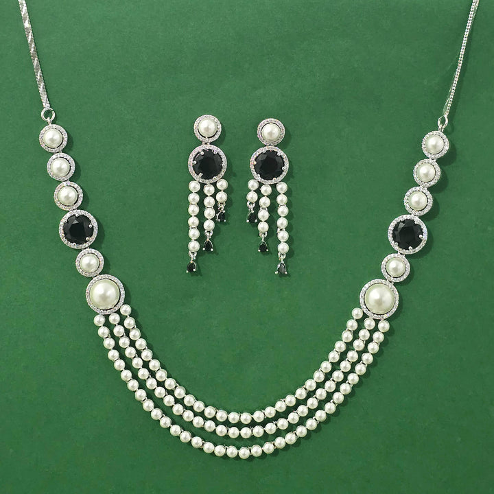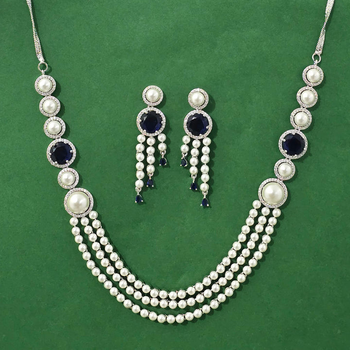 Weight: 53.0 Grams, Earring Height = 57 mm || Width = 15 mm,Regular Size And Adjustable,Moti Necklace,Rhodium Plating,American Diamond Necklace Set