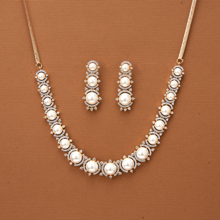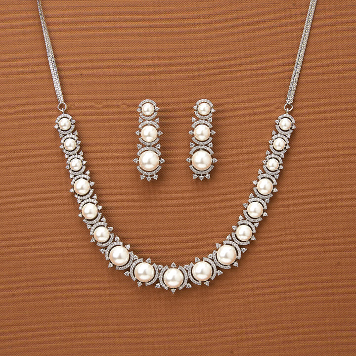 436978 Cubic Zirconia Pearl Necklace With 2 Tone Rhodium Plating