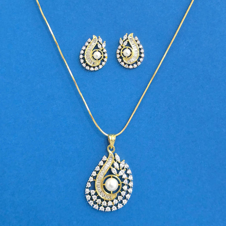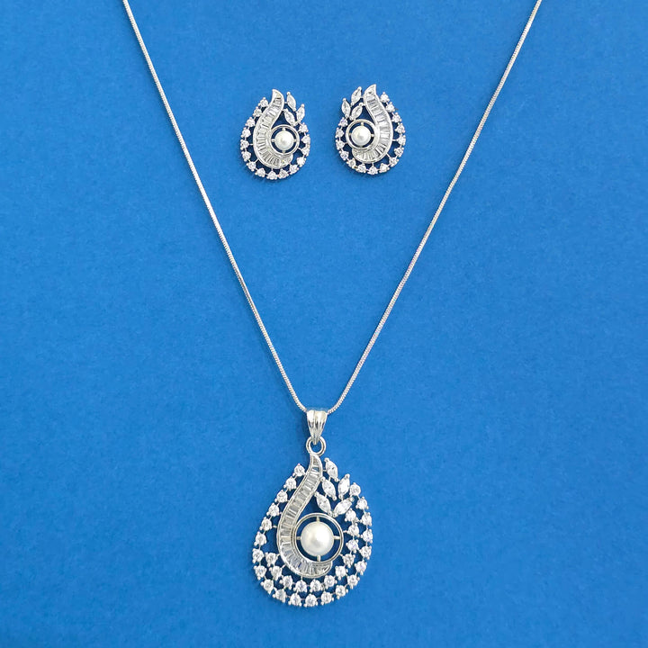 Weight: 18.0 Grams, Pendant Height = 45 Mm || Width = 25 Mm,Earring Height = 21 Mm || Width = 16 Mm,Length = 18 Inch,2 Tone Plating,Rhodium Plating,American Diamond Pendant Set