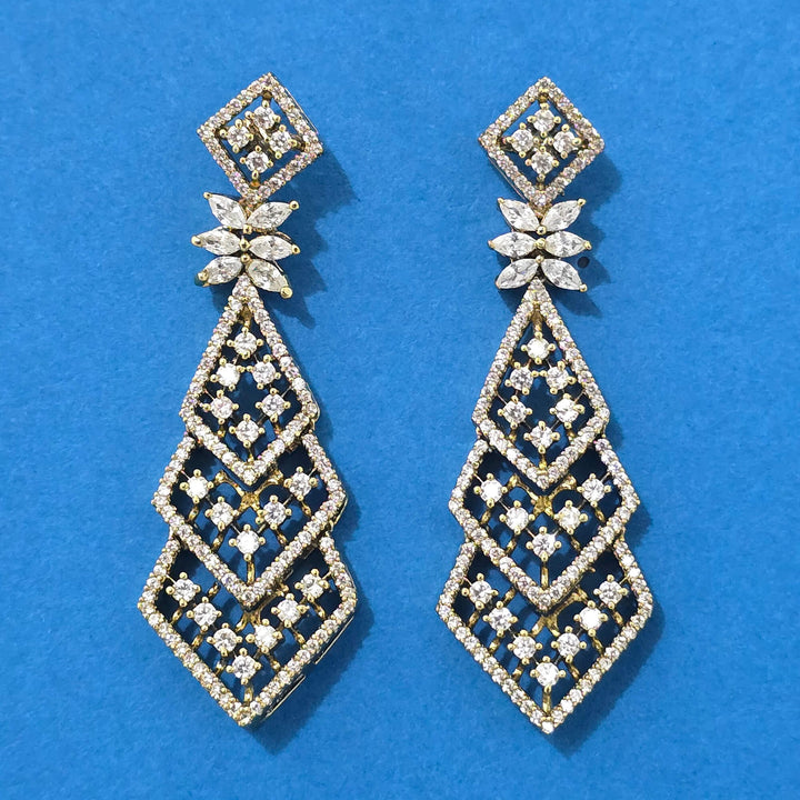 Weight: 14.0 Grams, Height = 54 mm || Width = 18 mm,Delicate Design,Mehndi Plating,2 Tone Plating,Rhodium Plating,American Diamond Earring