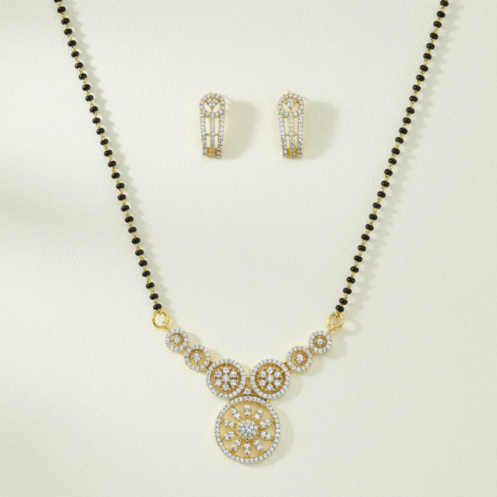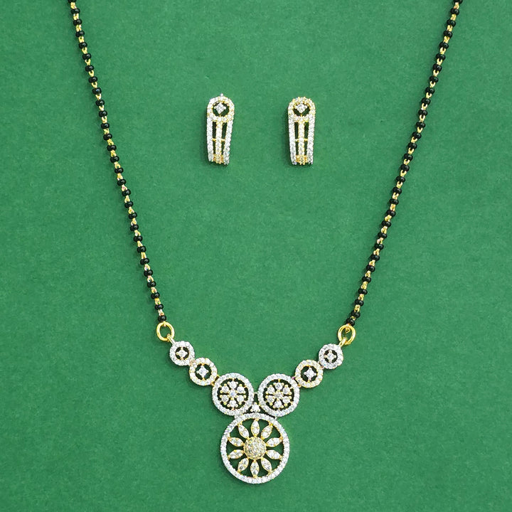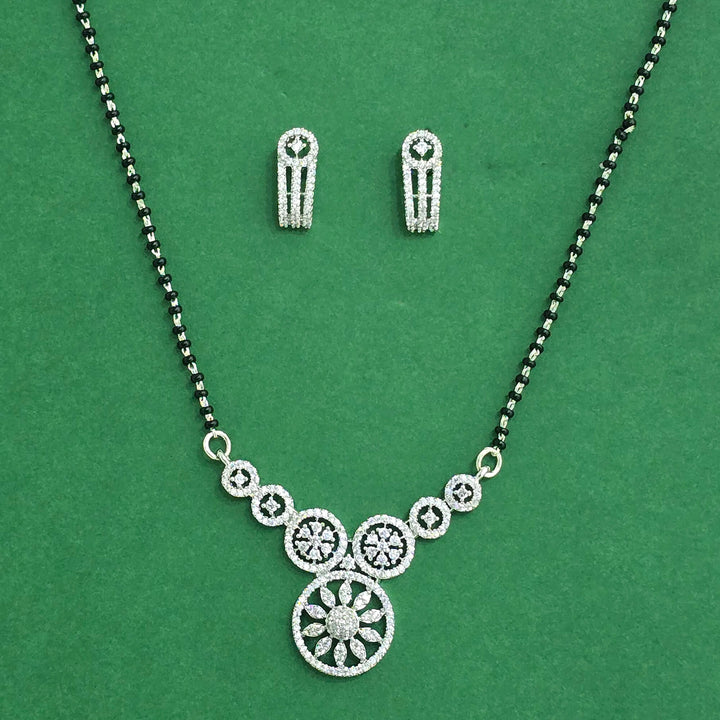Weight: 12.0 Grams, Pendant Height = 24 mm || Width = 40 mm,Earring Height = 15 mm || Width = 5 mm,Length = 24 Inch,2 Tone Plating,Rhodium Plating,American Diamond Mangal Sutra