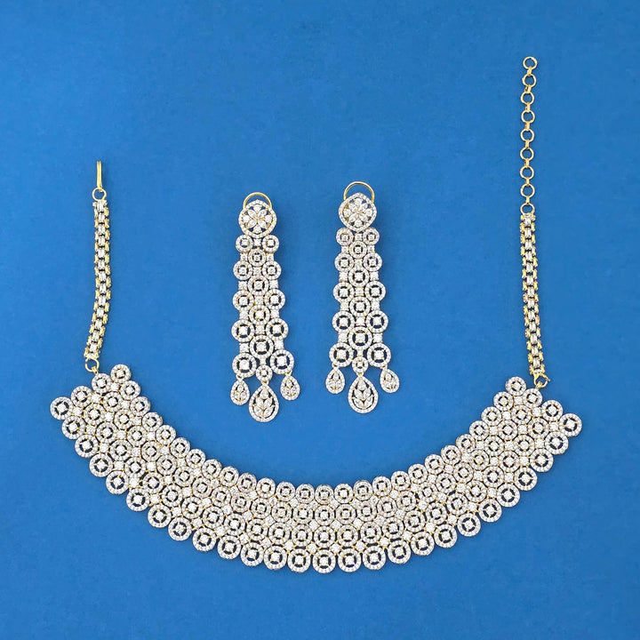 Weight: 113.0 Grams, Height = 80 mm || Width = 21 mm,Regular Size And Adjustable,Bollywood Look,2 Tone Plating,Rhodium Plating,American Diamond Necklace Set