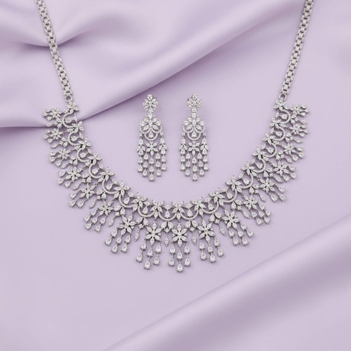 Weight: 99.0 Grams, Earring Height = 58 mm || Width = 30 mm,Regular Size And Adjustable,Elegant Look,2 Tone Plating,Rhodium Plating,American Diamond Necklace Set