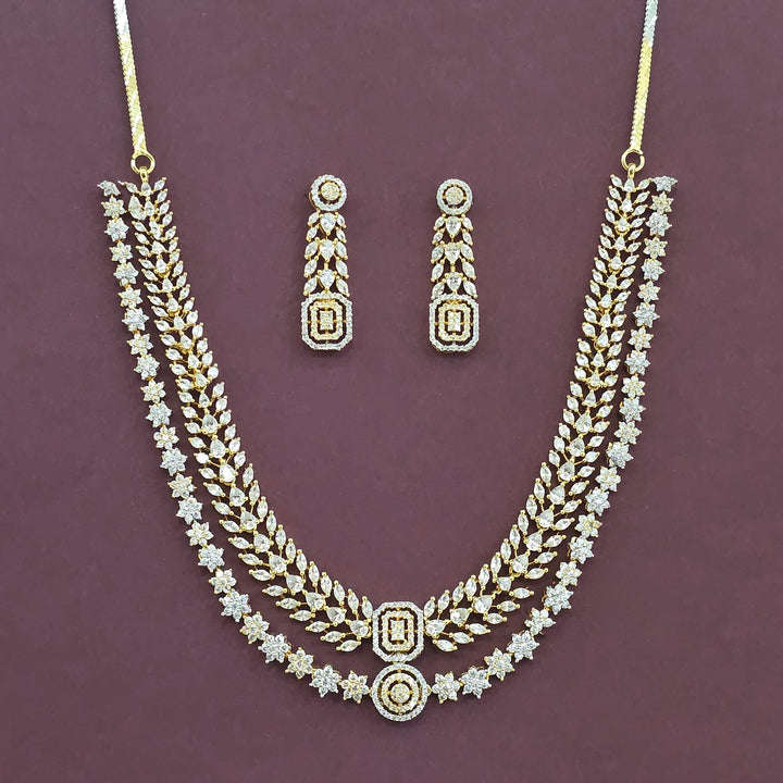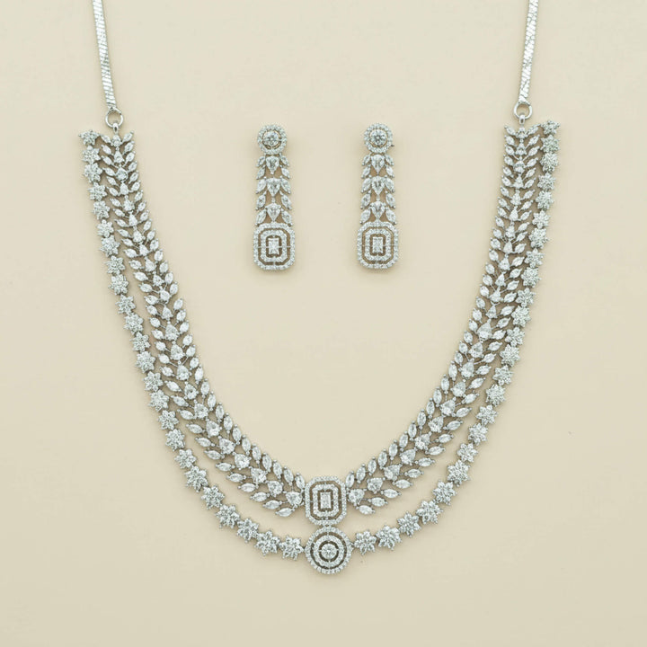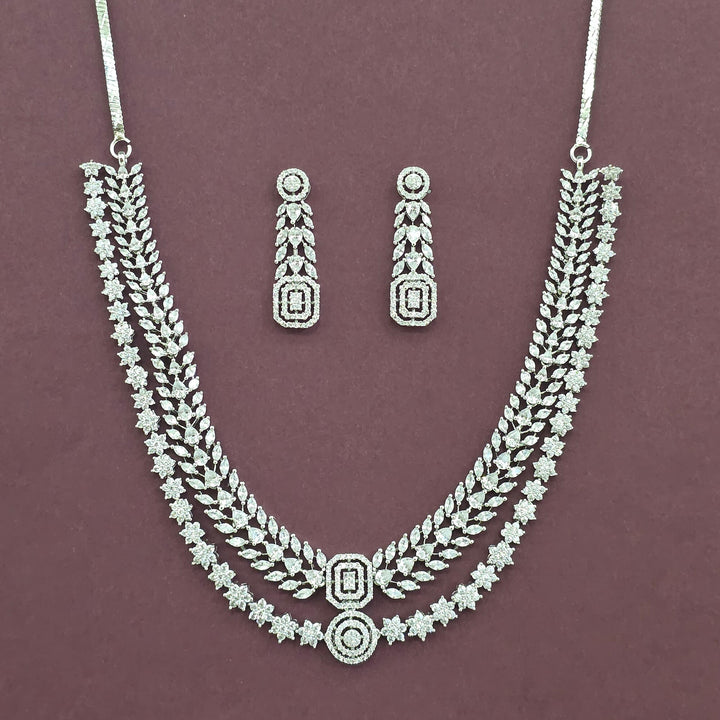 Weight: 49.0 Grams, Earring Height = 35 Mm || Width = 10 Mm,Regular Size And Adjustable,Trendy Look,2 Tone Plating,Rhodium Plating,American Diamond Necklace Set