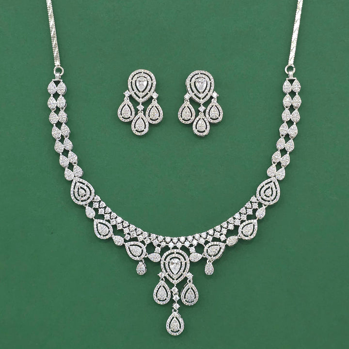 Weight: 41.0 Grams, Height = 32 mm || Width = 22 mm,Regular Size And Adjustable,Bollywood Look,2 Tone Plating,Rhodium Plating,American Diamond Necklace Set