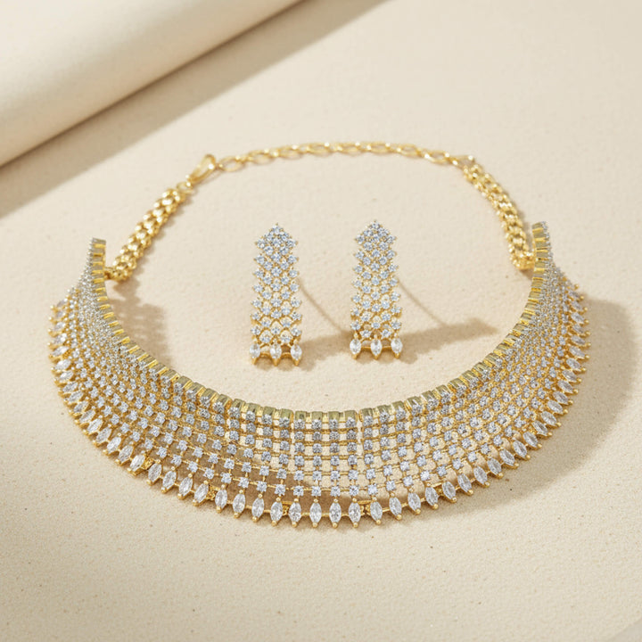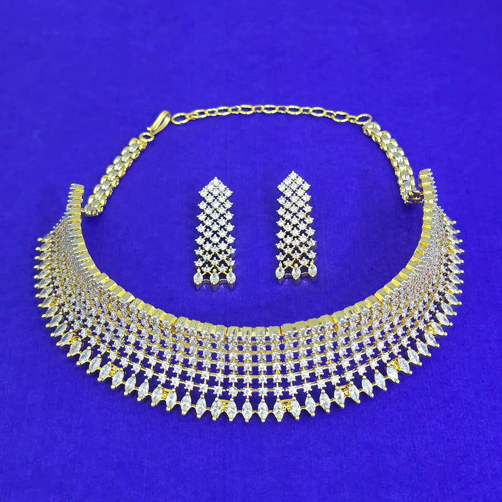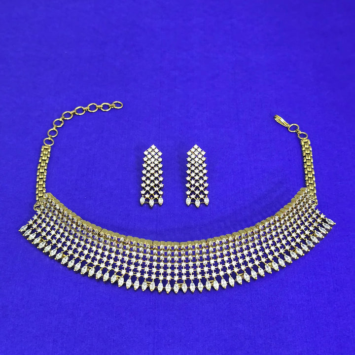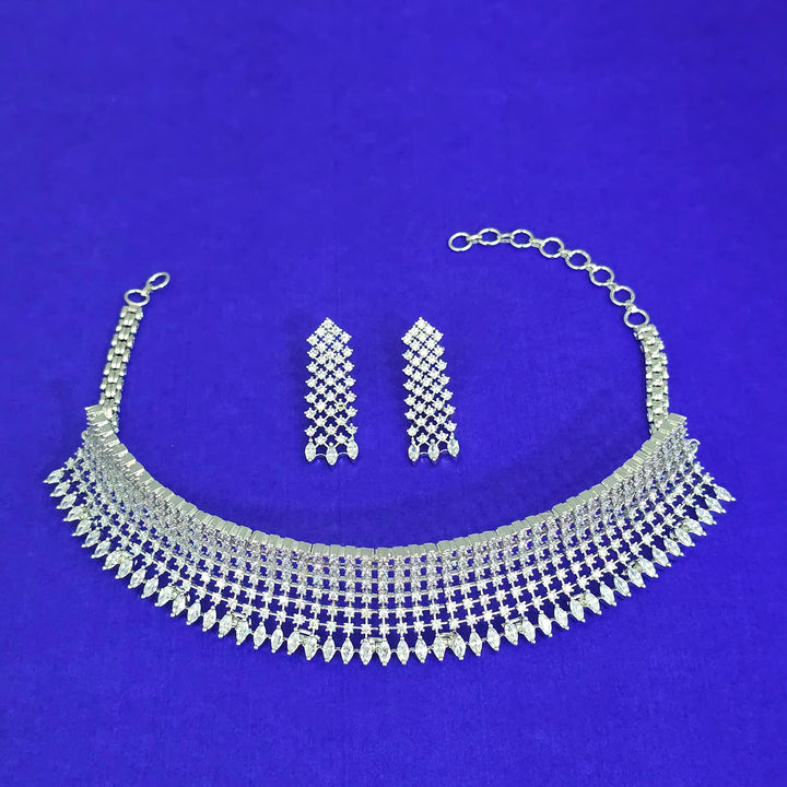Weight: 60.0 Grams, Height = 40 mm || Width = 12 mm,Regular Size And Adjustable,Mukut Necklace,Mehndi Plating,2 Tone Plating,Rhodium Plating,American Diamond Necklace Set