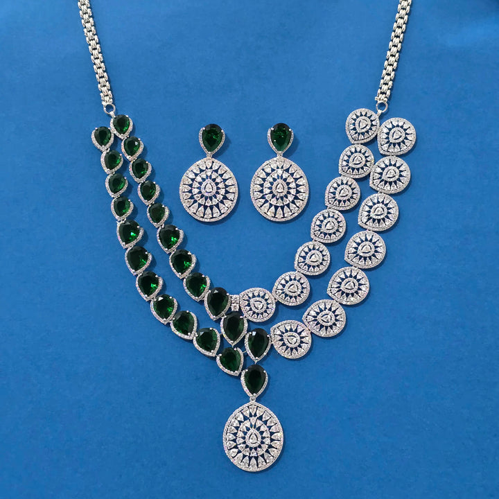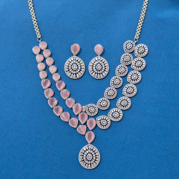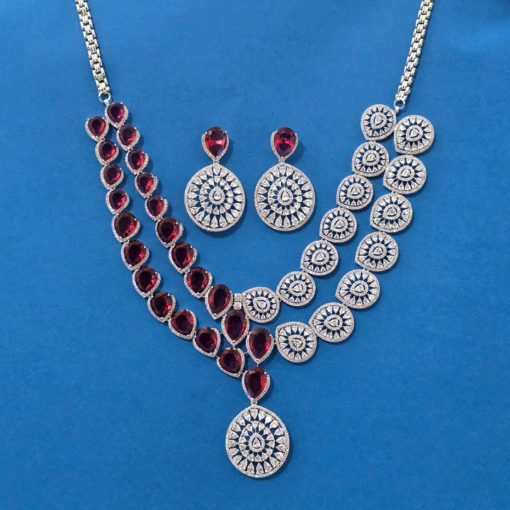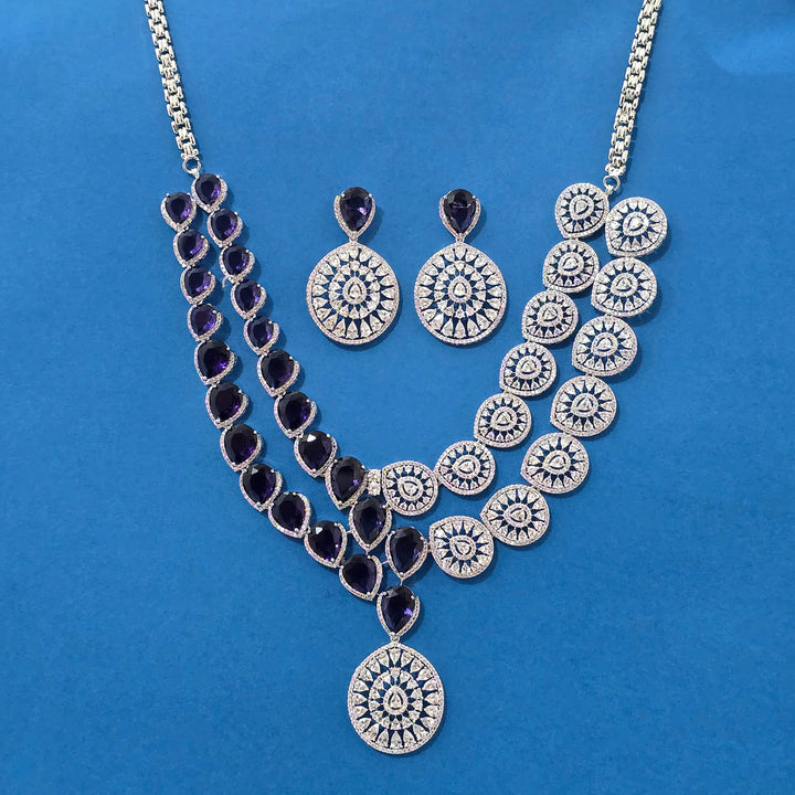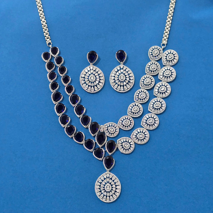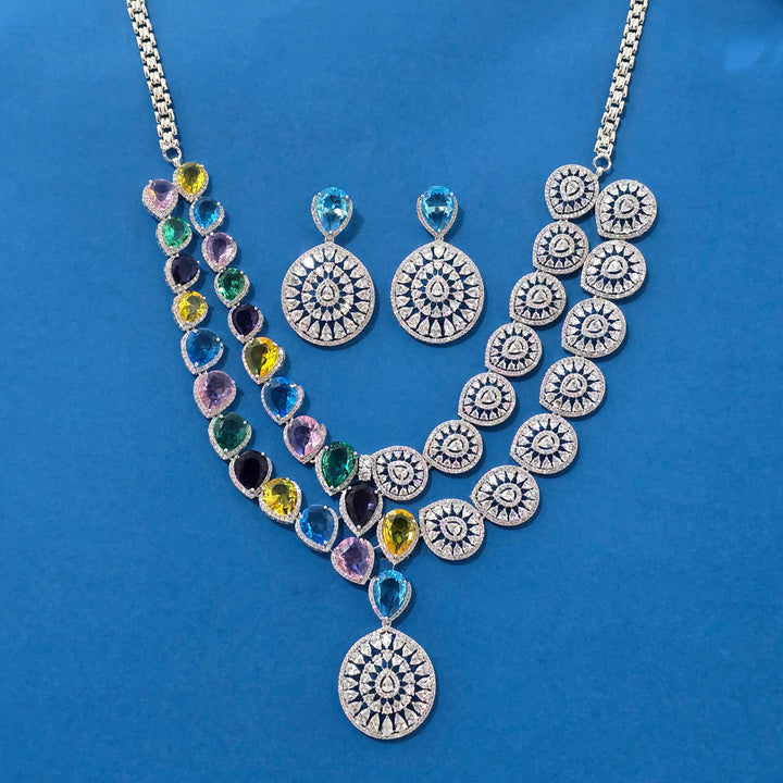 Weight: 91.0 Grams, Earring Height = 48 mm || Width = 27 mm,Regular Size And Adjustable,Elegant Look,Rhodium Plating,American Diamond Necklace Set