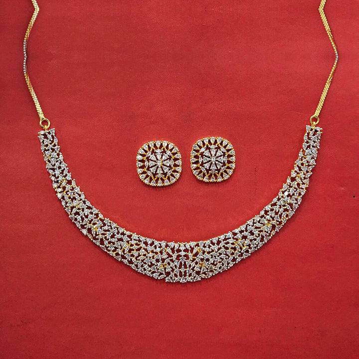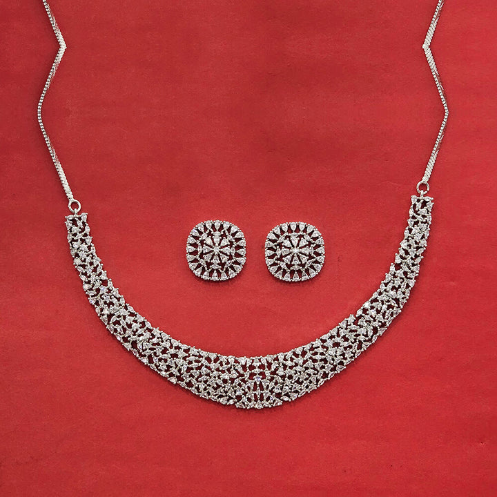 Weight: 39.0 Grams, Earring Height = 21 mm || Width = 21 mm,Regular Size And Adjustable,Handmade Design,2 Tone Plating,Rhodium Plating,American Diamond Necklace Set