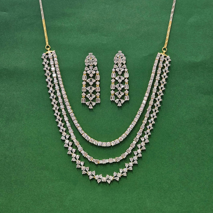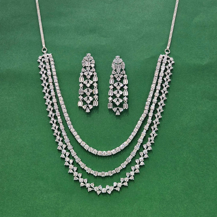 Weight: 69.0 Grams, Earring Height = 54 mm || Width = 18 mm,Regular Size And Adjustable,3 Line Necklace,2 Tone Plating,Rhodium Plating,American Diamond Necklace Set