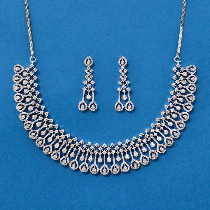 Weight: 68.0 Grams, Earring Height = 45 mm || Width = 16 mm,Regular Size And Adjustable,Bollywood Look,2 Tone Plating,Rhodium Plating,American Diamond Necklace Set