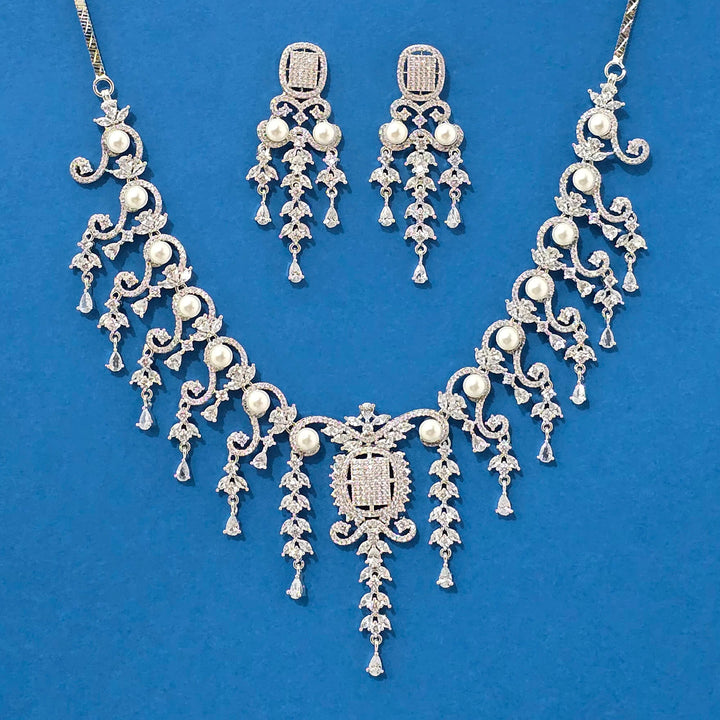 Weight: 72.0 Grams, Earring Height = 56 mm || Width = 25 mm,Regular Size And Adjustable,2 Tone Plating,Rhodium Plating,American Diamond Necklace Set
