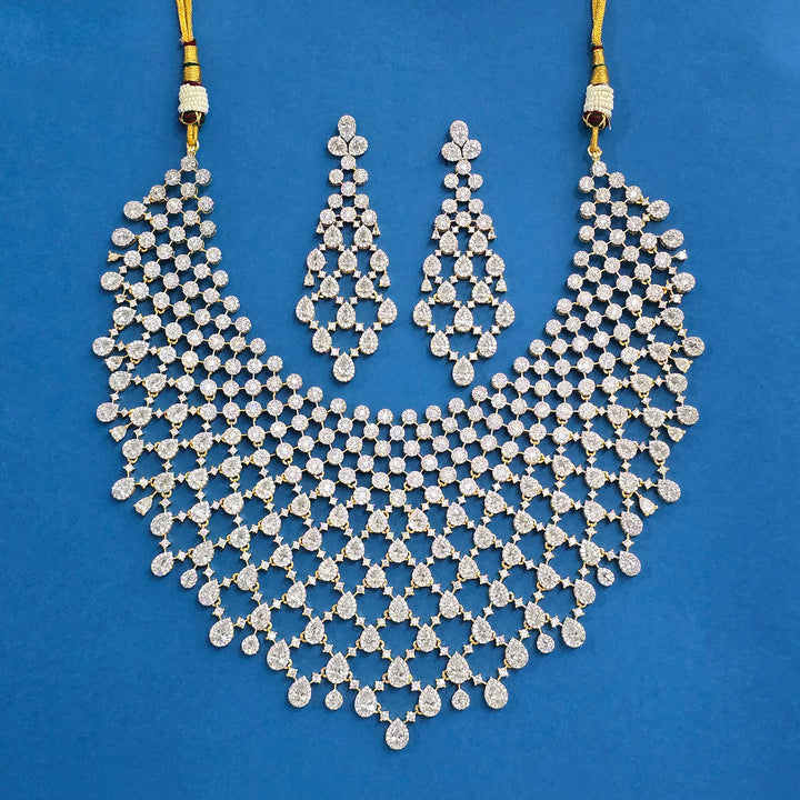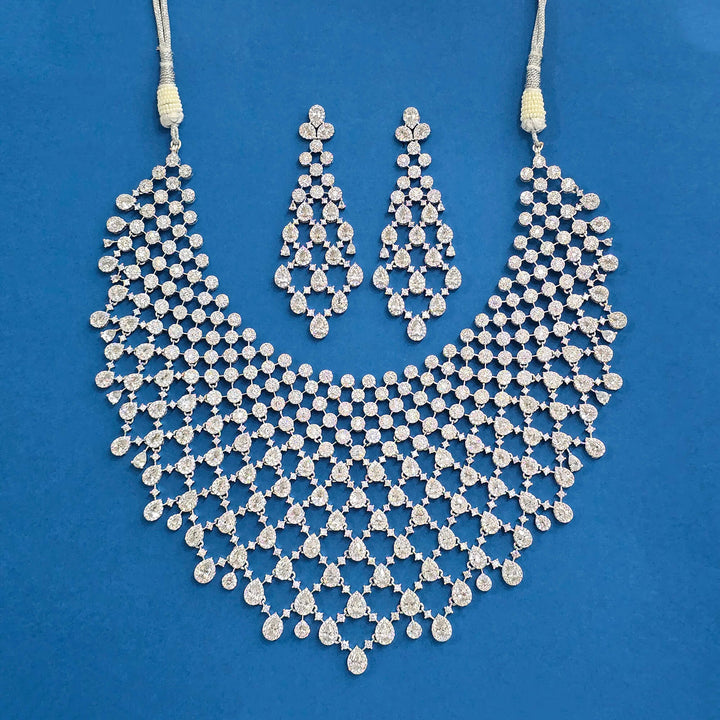 Weight: 170.0 Grams, Earring Height = 85 mm || Width = 32 mm,Regular Size (Approx 14 Inch) & Adjustable,2 Tone Plating,Rhodium Plating,American Diamond Necklace Set