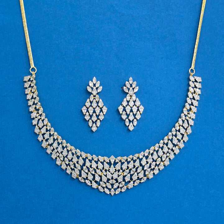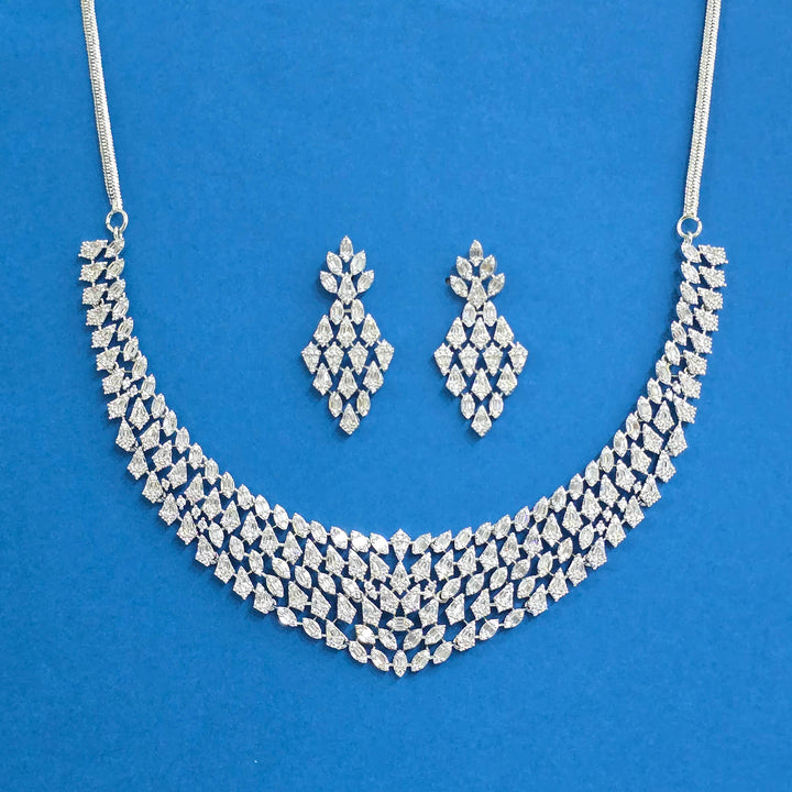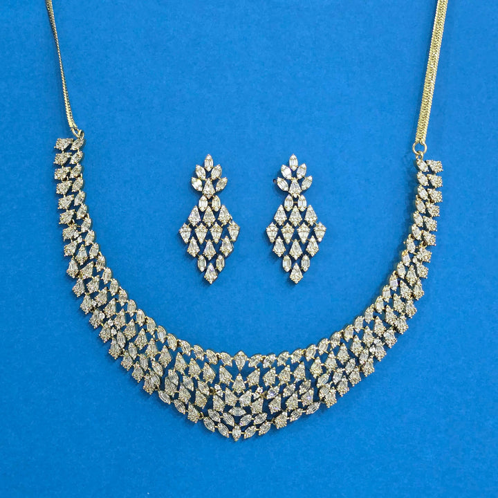 Weight: 49.0 Grams, Earring Height = 42 mm || Width = 20 mm,Regular Size And Adjustable,Elegant Look,Mehndi Plating,2 Tone Plating,Rhodium Plating,American Diamond Necklace Set