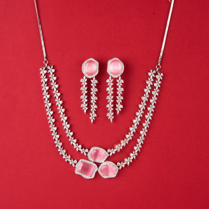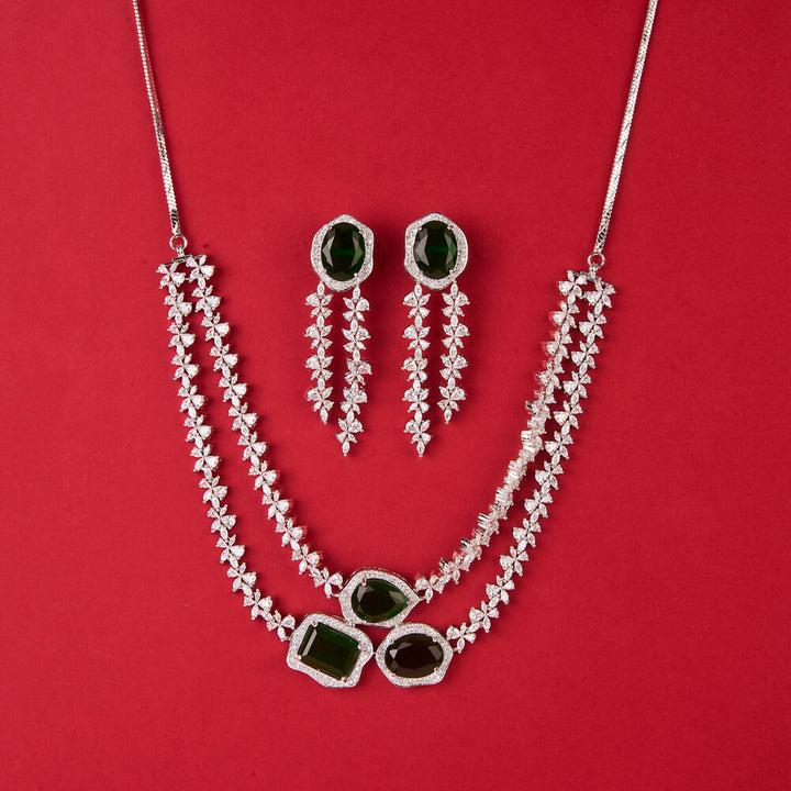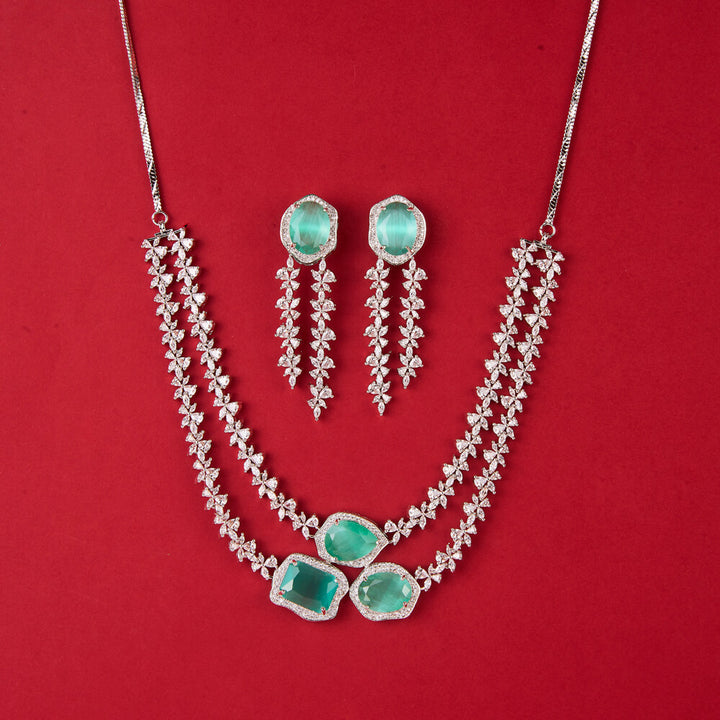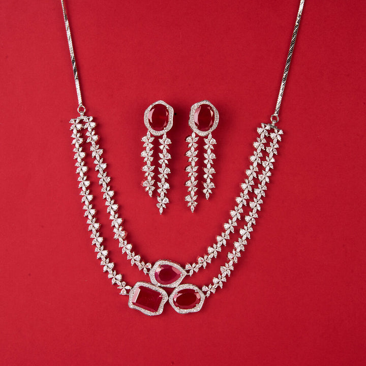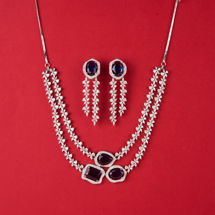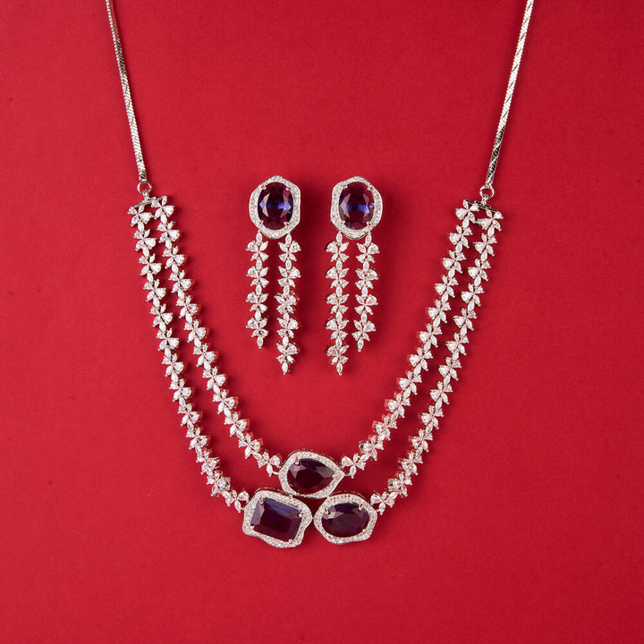 Weight: 77.0 Grams, Earring Height = 65 mm || Width = 18 mm,Regular Size And Adjustable,Bollywood Look,Rhodium Plating,American Diamond Necklace Set