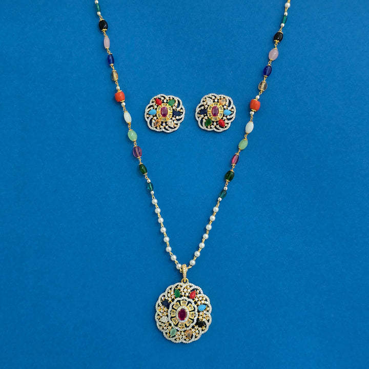 Weight: 42.0 Grams, Pendant Height = 48 mm || Width = 35 mm,Earring Height = 27 mm || Width = 27 mm,Length = 18 Inch,2 Tone Plating,American Diamond Pendant Set