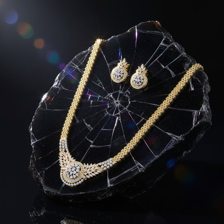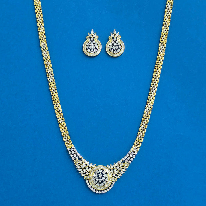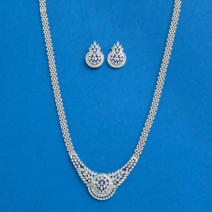 Weight: 49.0 Grams, Pendant Height = 25 mm || Width = 65 mm,Earring Height = 28 mm || Width = 14 mm,Length = 16 Inch,2 Tone Plating,Rhodium Plating,American Diamond Pendant Set