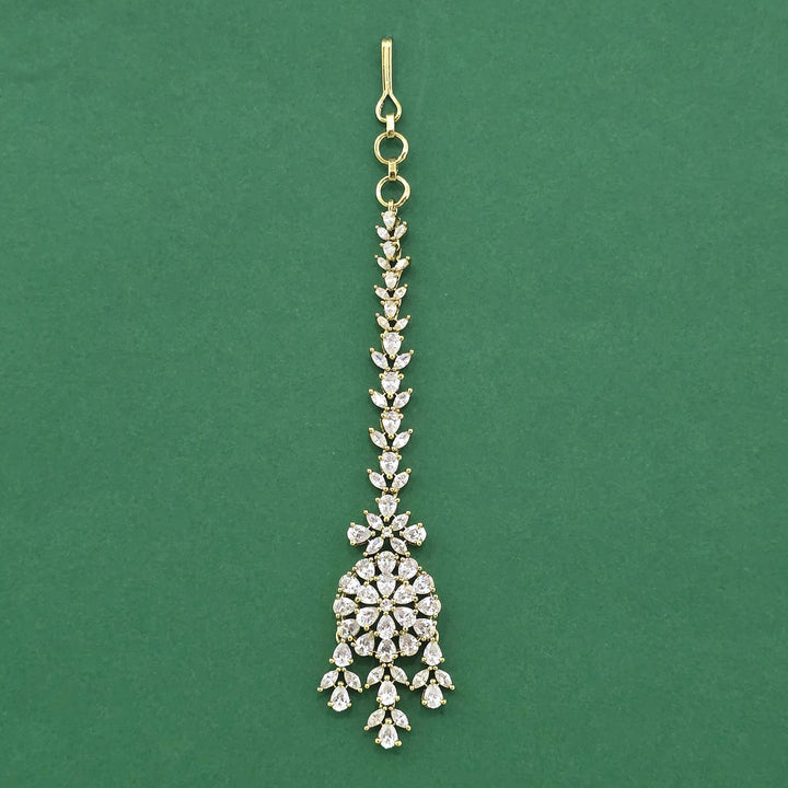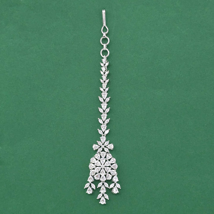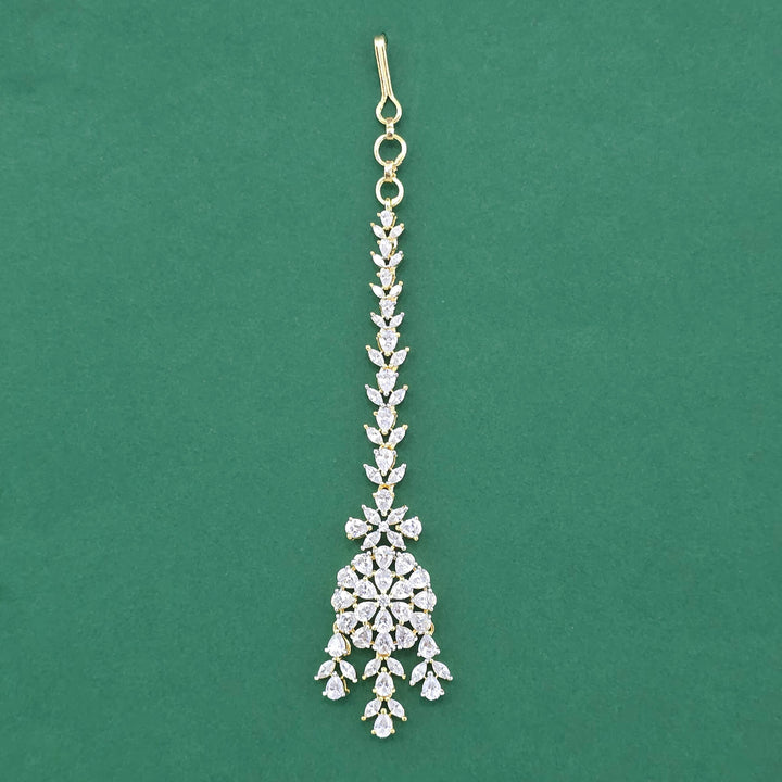 Weight: 9.0 Grams, Height = 124 mm || Width = 25 mm,Handmade Design,Mehndi Plating,2 Tone Plating,Rhodium Plating,American Diamond Maang Tikka
