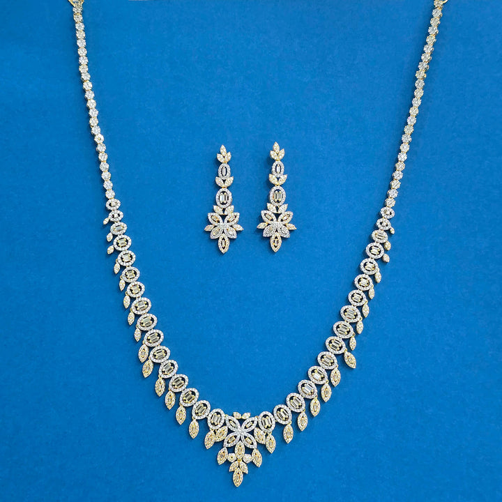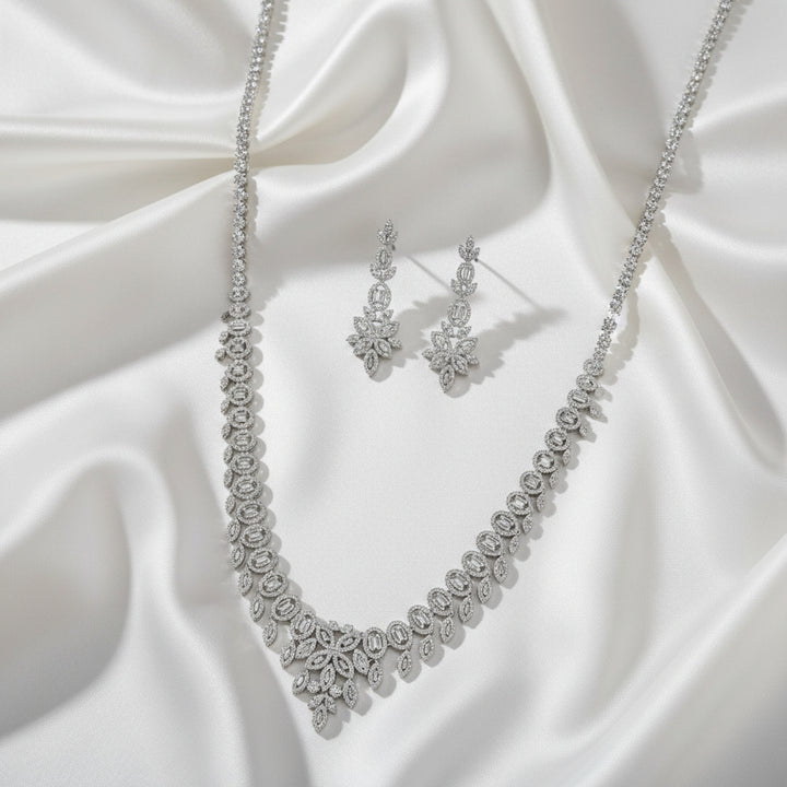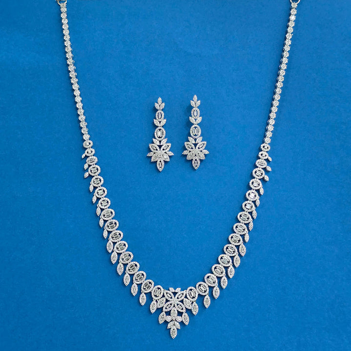 Weight: 47.0 Grams, Earring Height = 45 mm || Width = 15 mm,Regular Size And Adjustable,Handmade Design,2 Tone Plating,Rhodium Plating,American Diamond Necklace Set