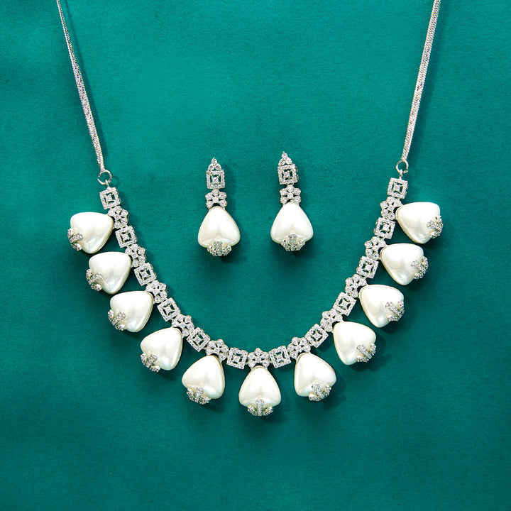 434176 Cz Pearl Necklace With 2 Tone Rhodium Plating
