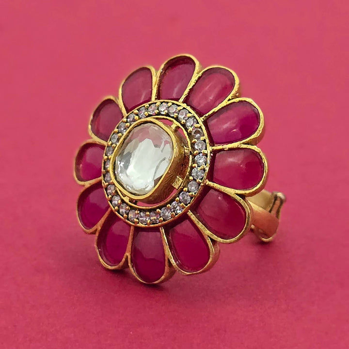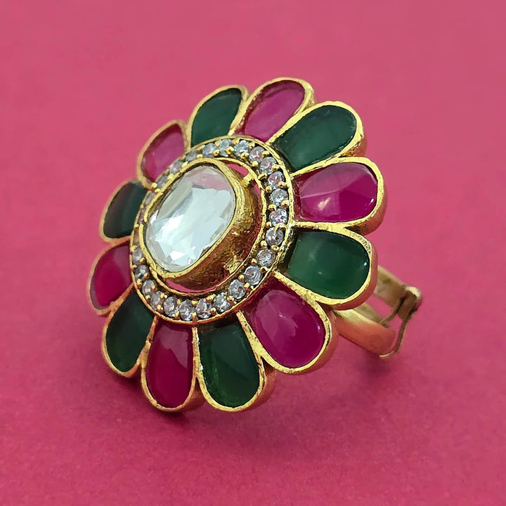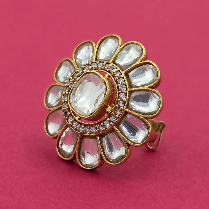 352240 Kundan Adjustable Ring With Matte Gold Plating