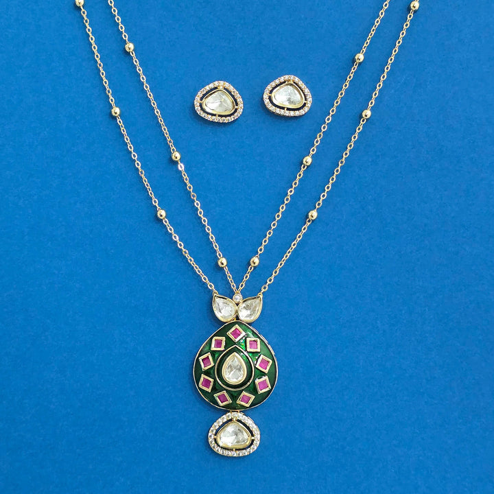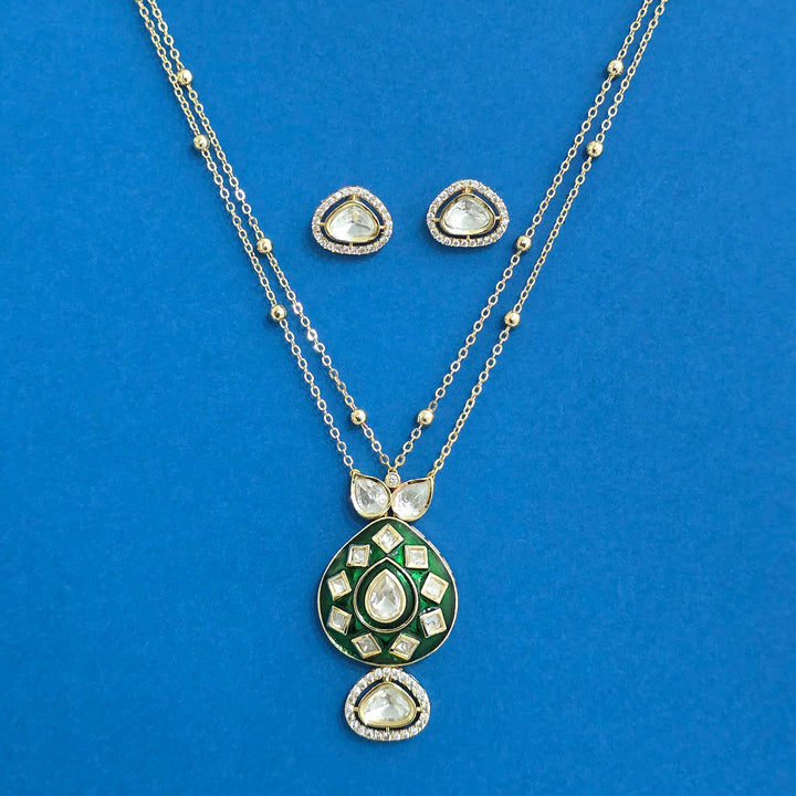 Weight: 19.0 Grams, Pendant Height = 48 Mm || Width = 25 Mm,Earring Height = 13 Mm || Width = 15 Mm,Length = 18 Inch,Carat Plating,Kundan Pendant Set